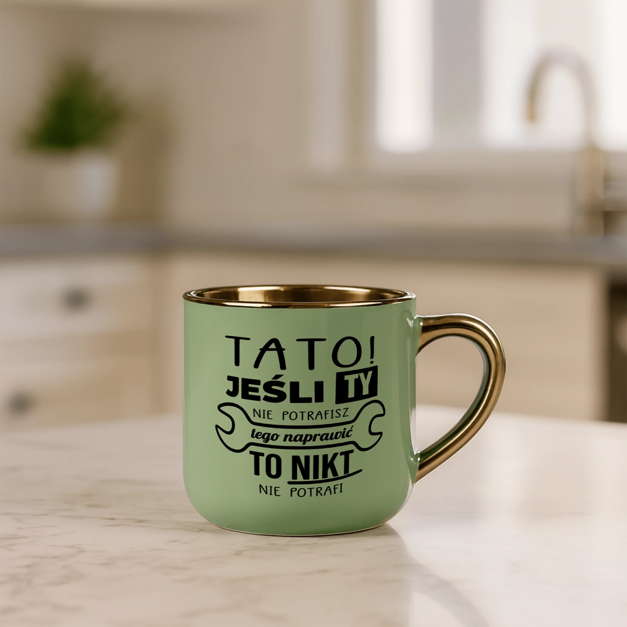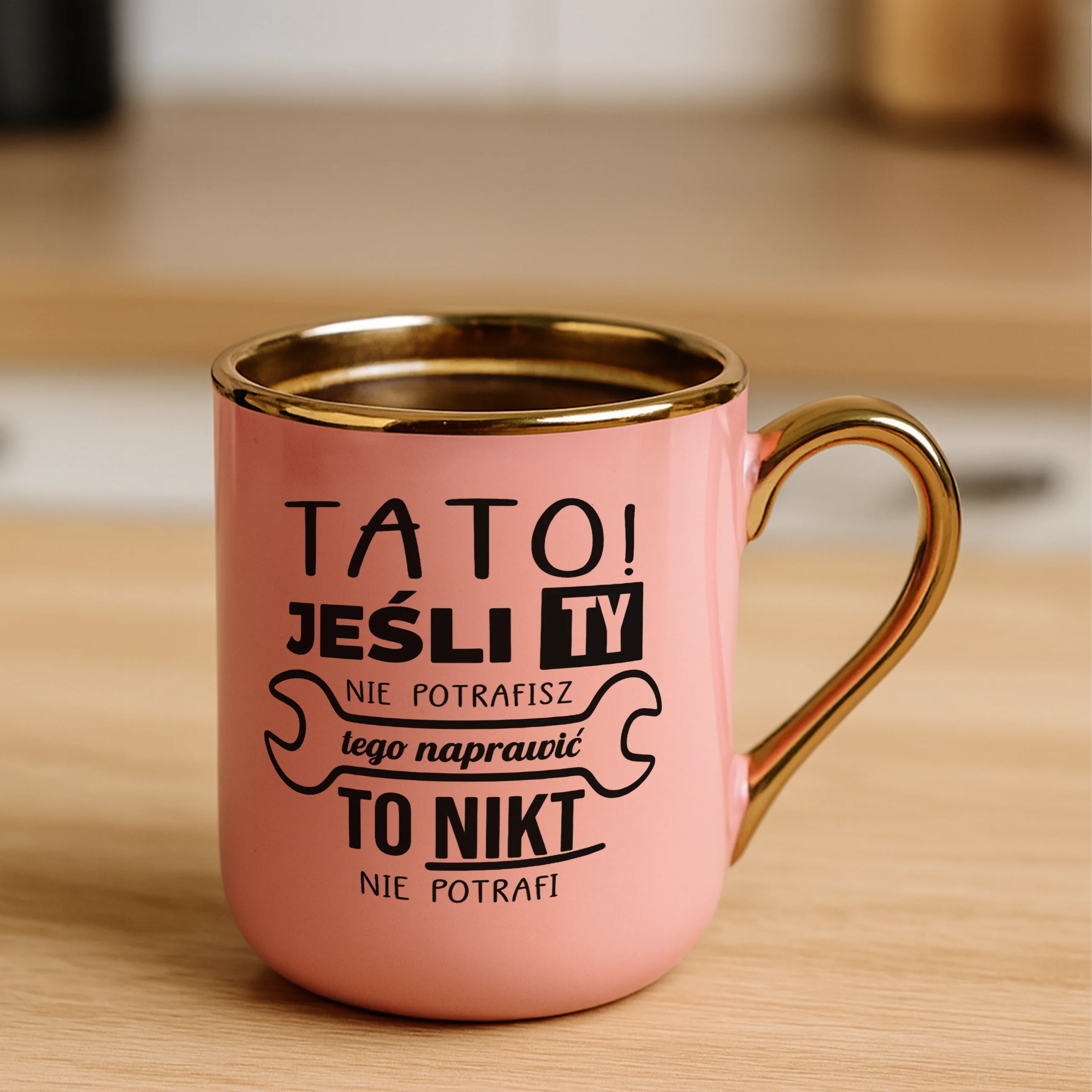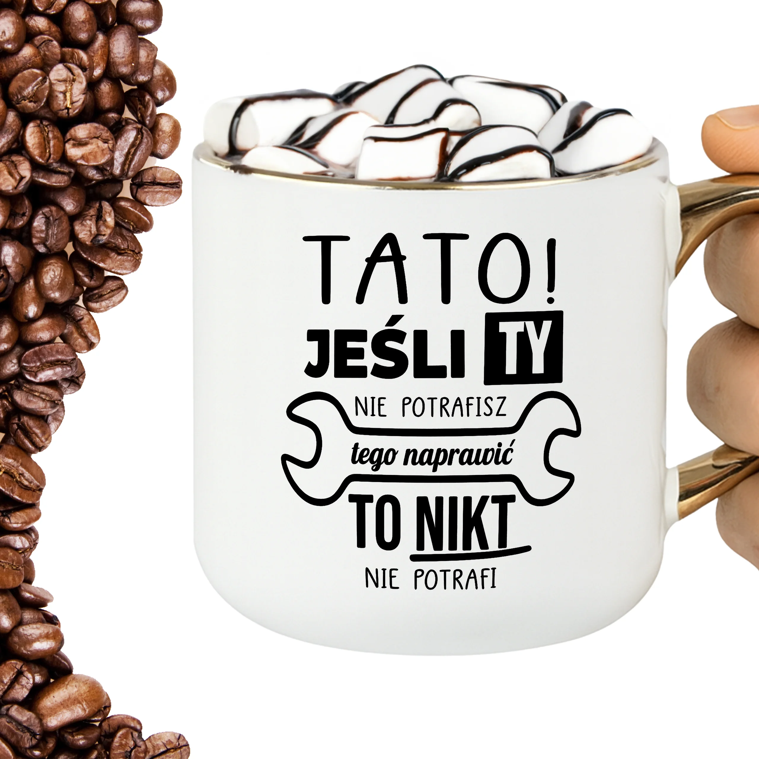 Przepiękny kubek ze złotą rączką oraz rantem z nadrukiem tato jeśli ty nie potrafisz tego naprawić to nikt nie potrafi