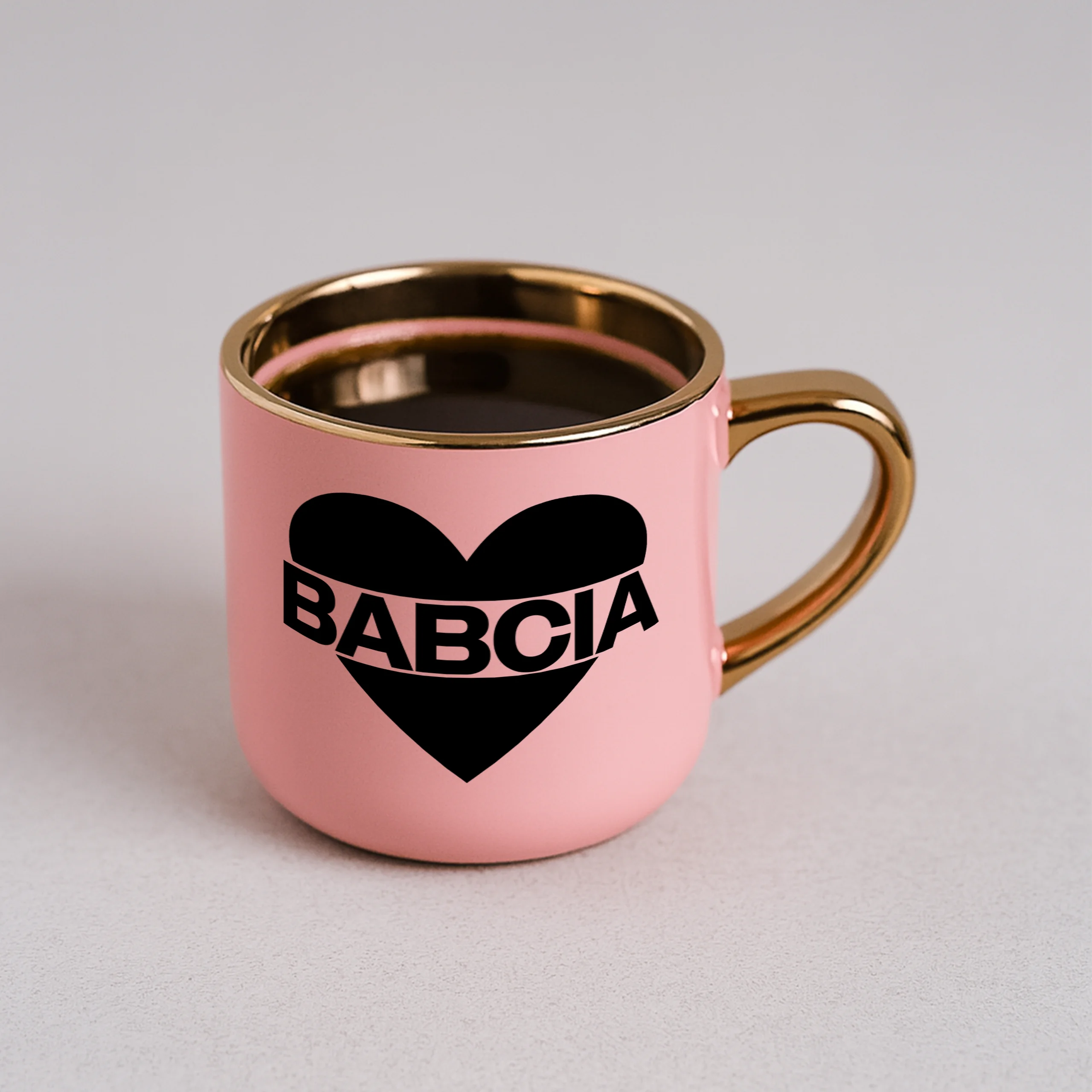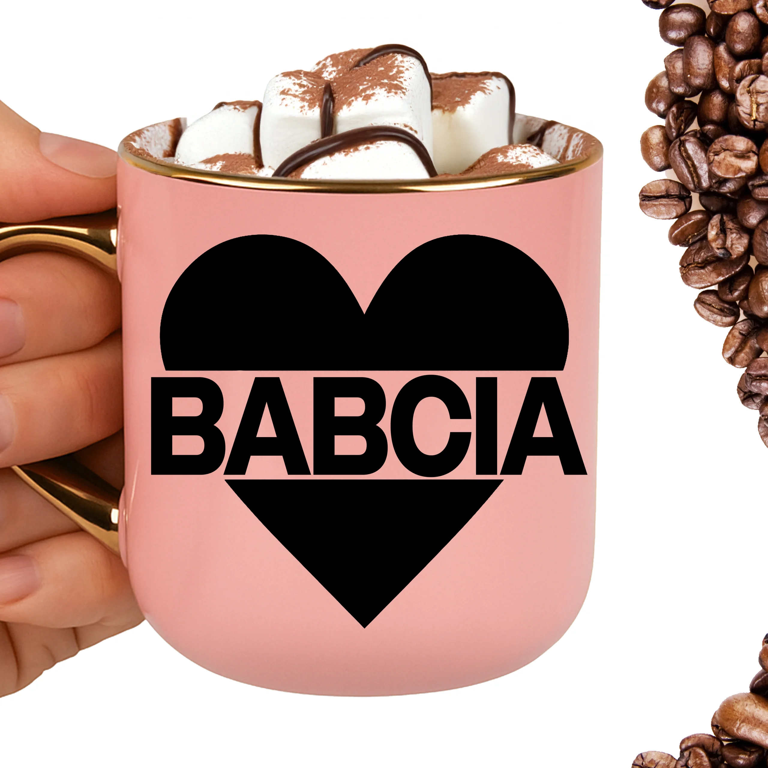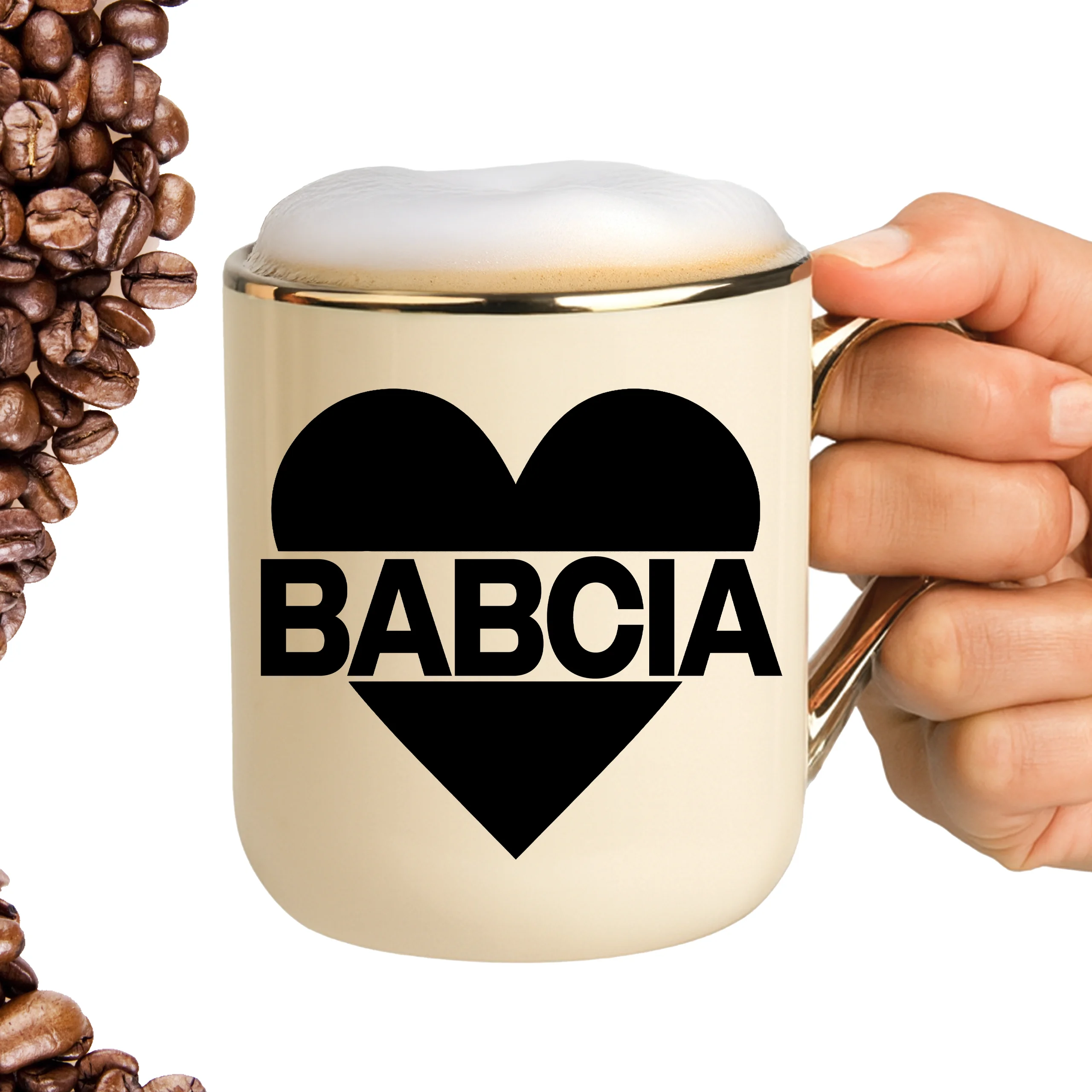 Przepiękny kubek ze złotą rączką oraz rantem z nadrukiem babcia