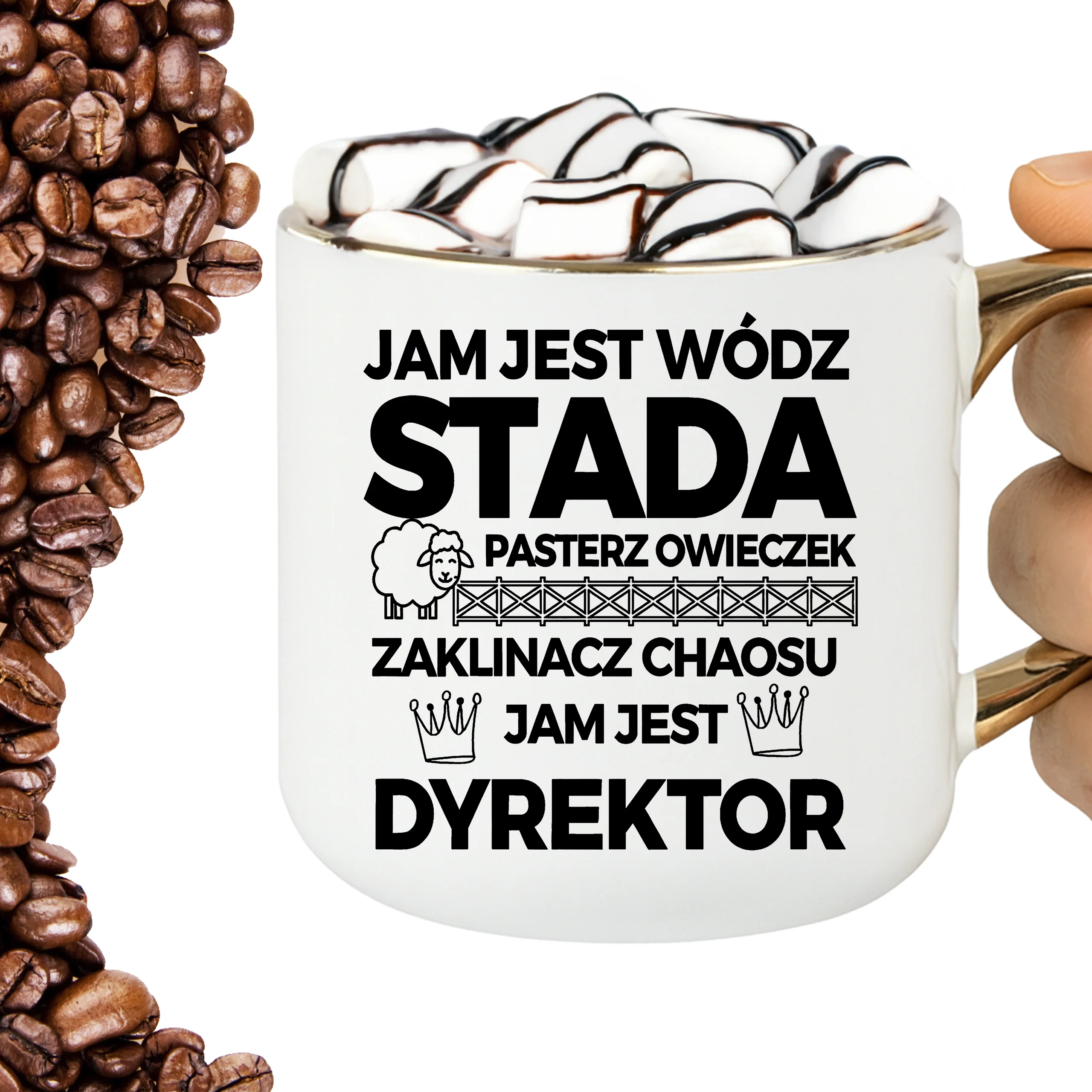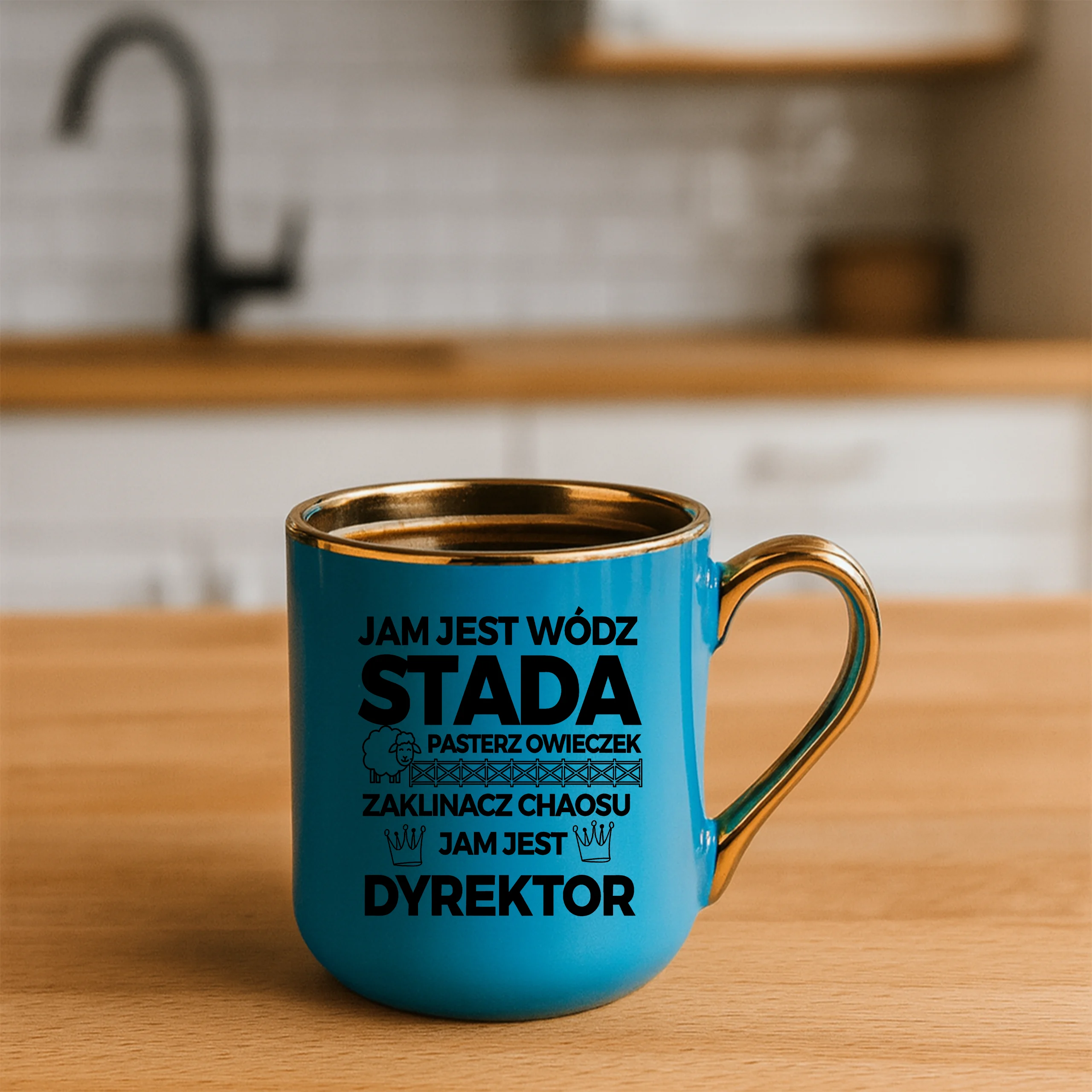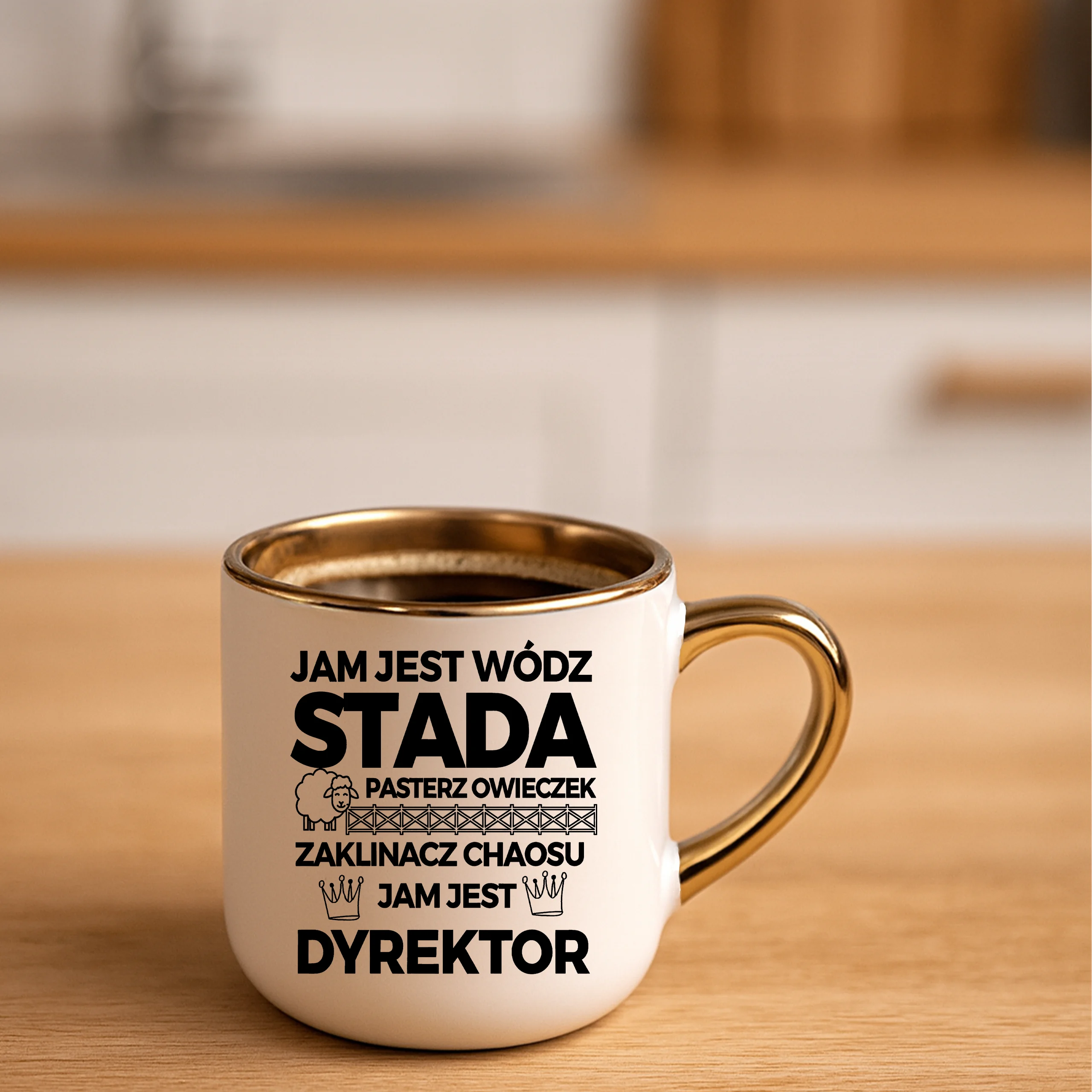 Przepiękny kubek ze złotą rączką oraz rantem z nadrukiem jam jest wódz stada