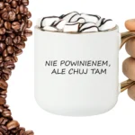 Przepiękny kubek ze złotą rączką oraz rantem z nadrukiem nie powinienem ale chuj tam