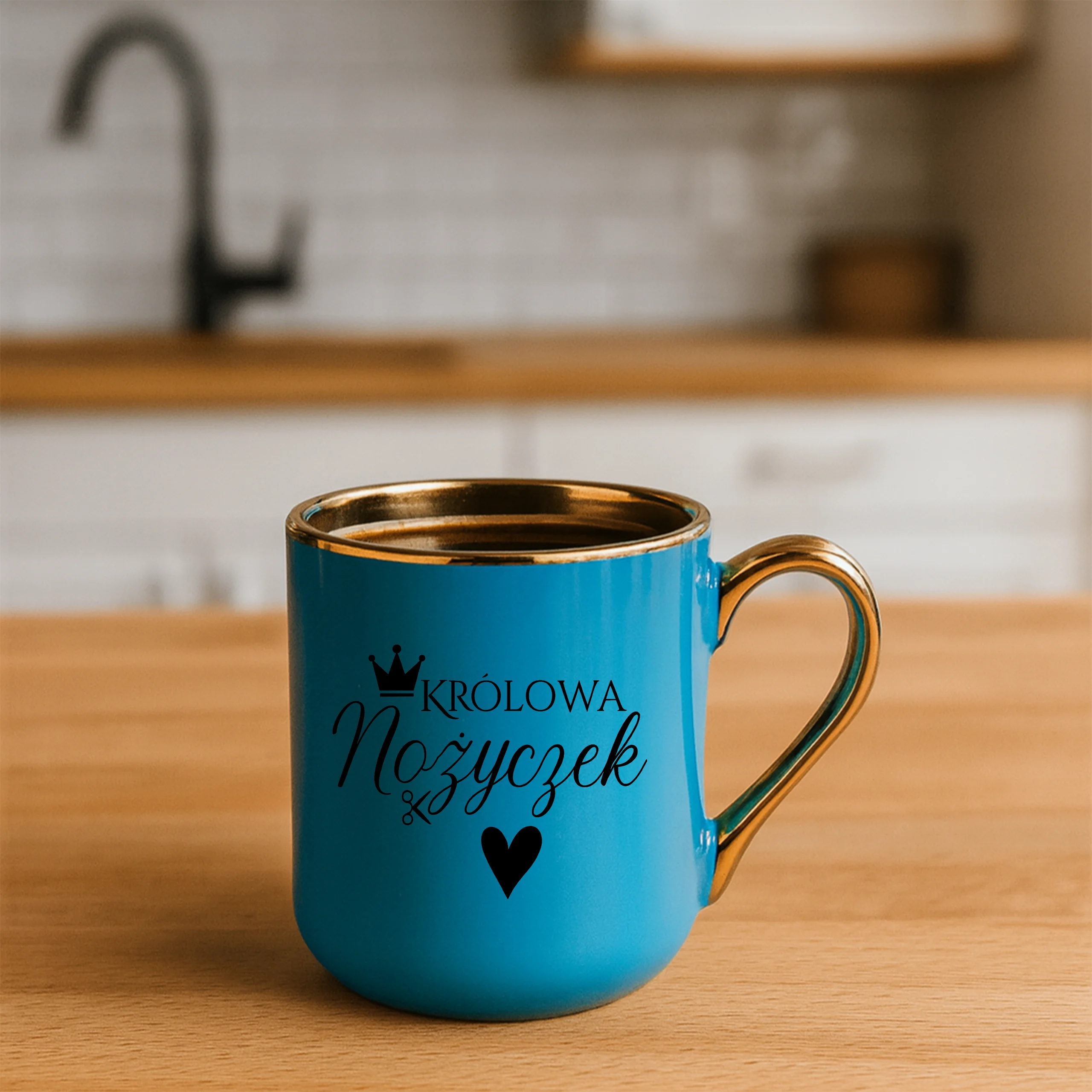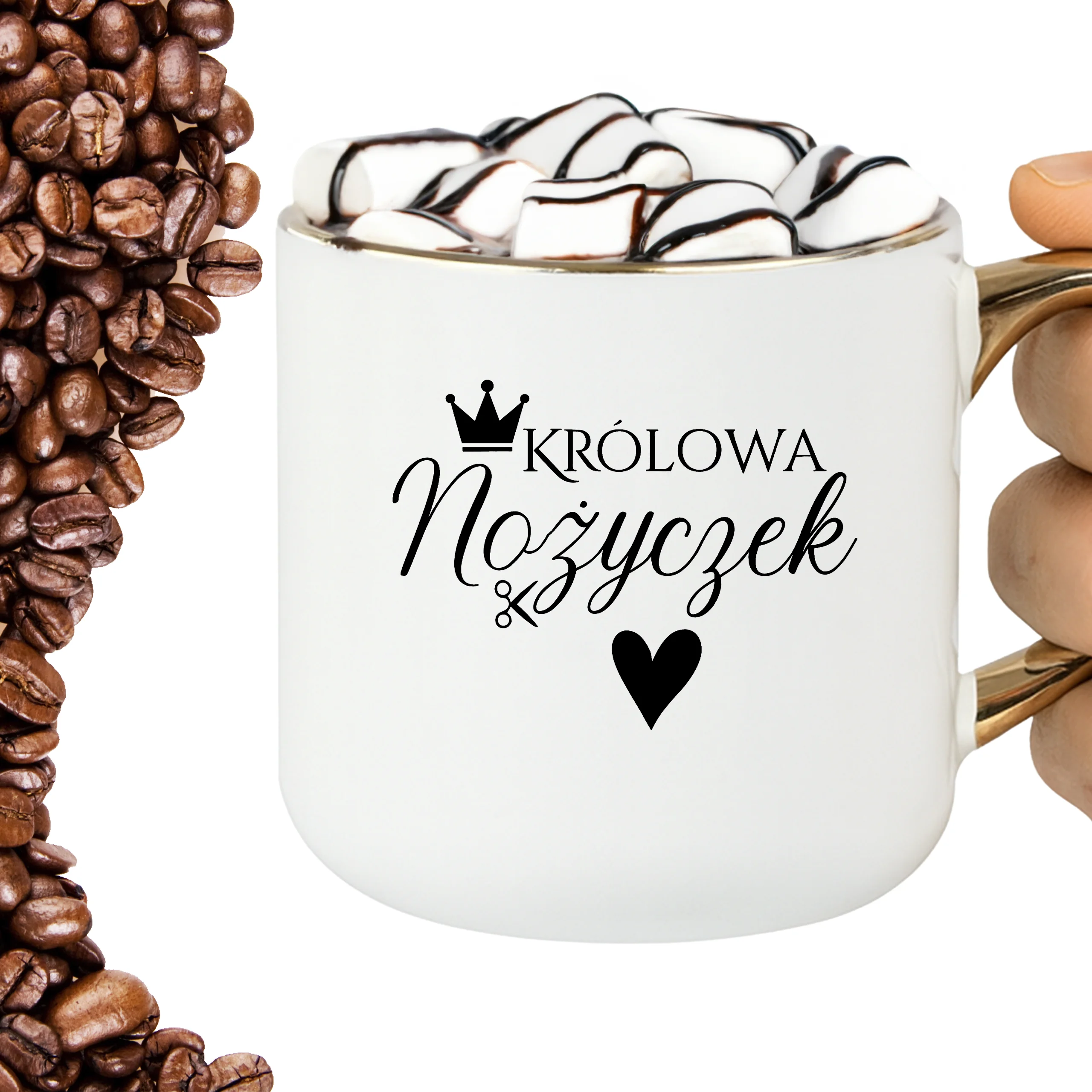 Przepiękny kubek ze złotą rączką oraz rantem z nadrukiem królowa nożyczek