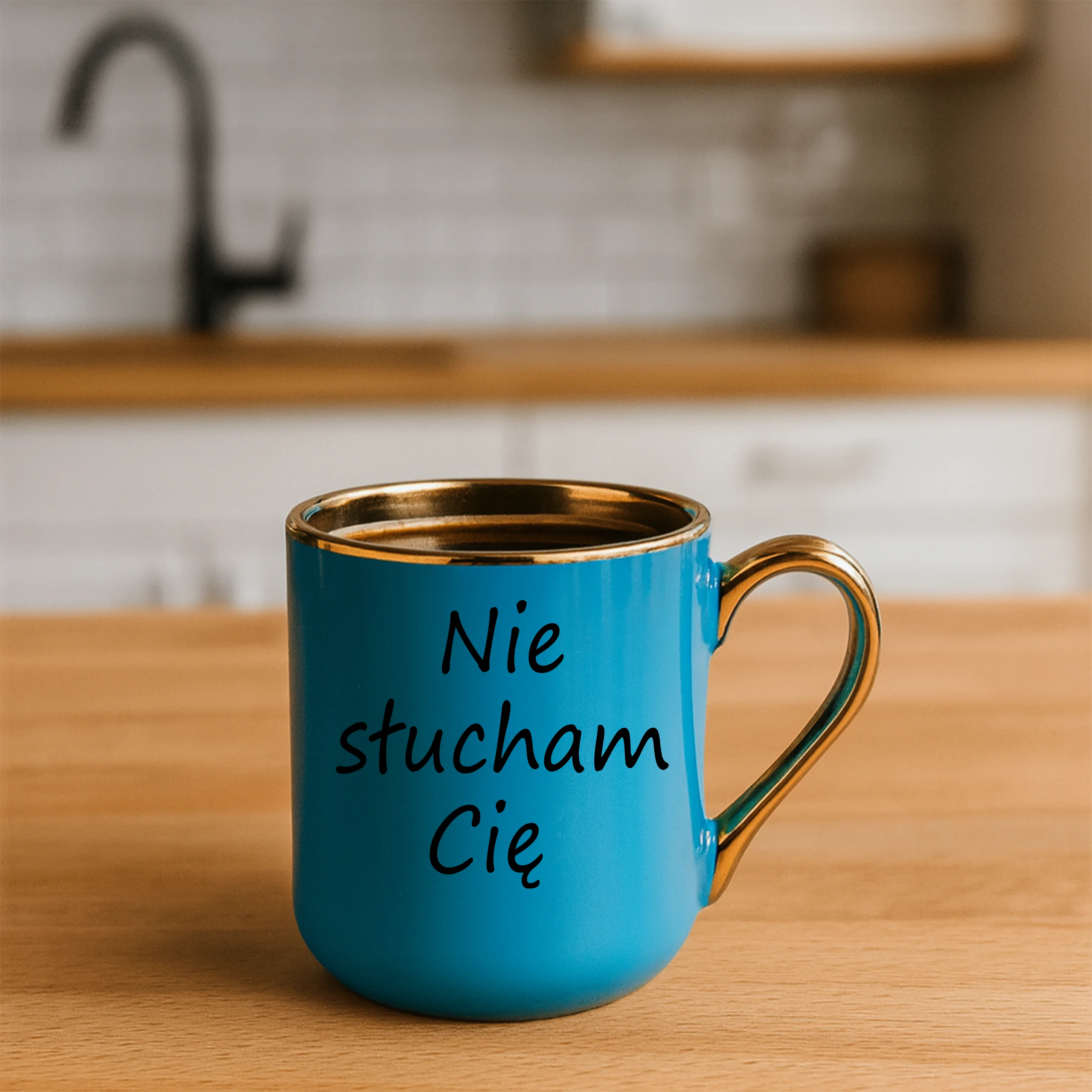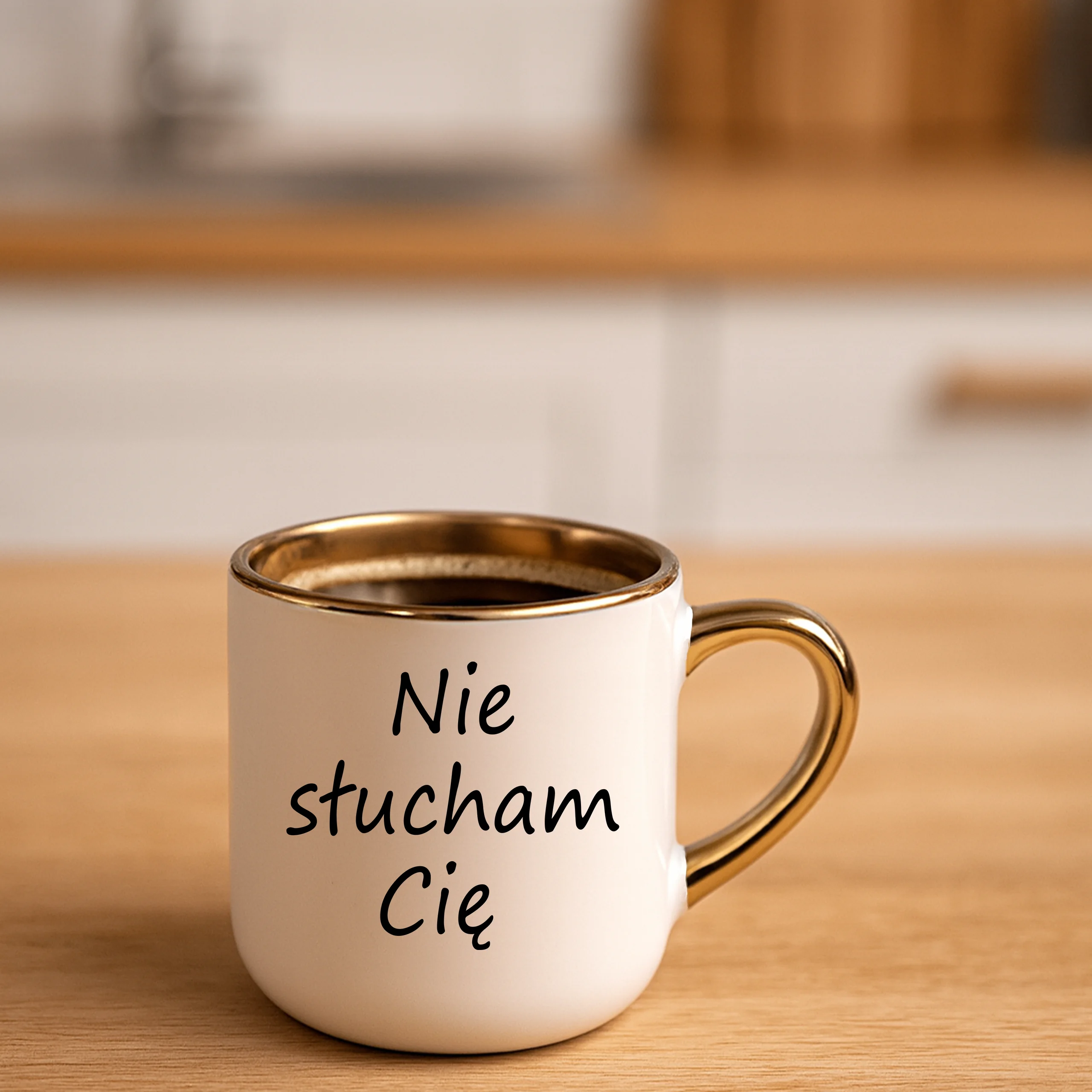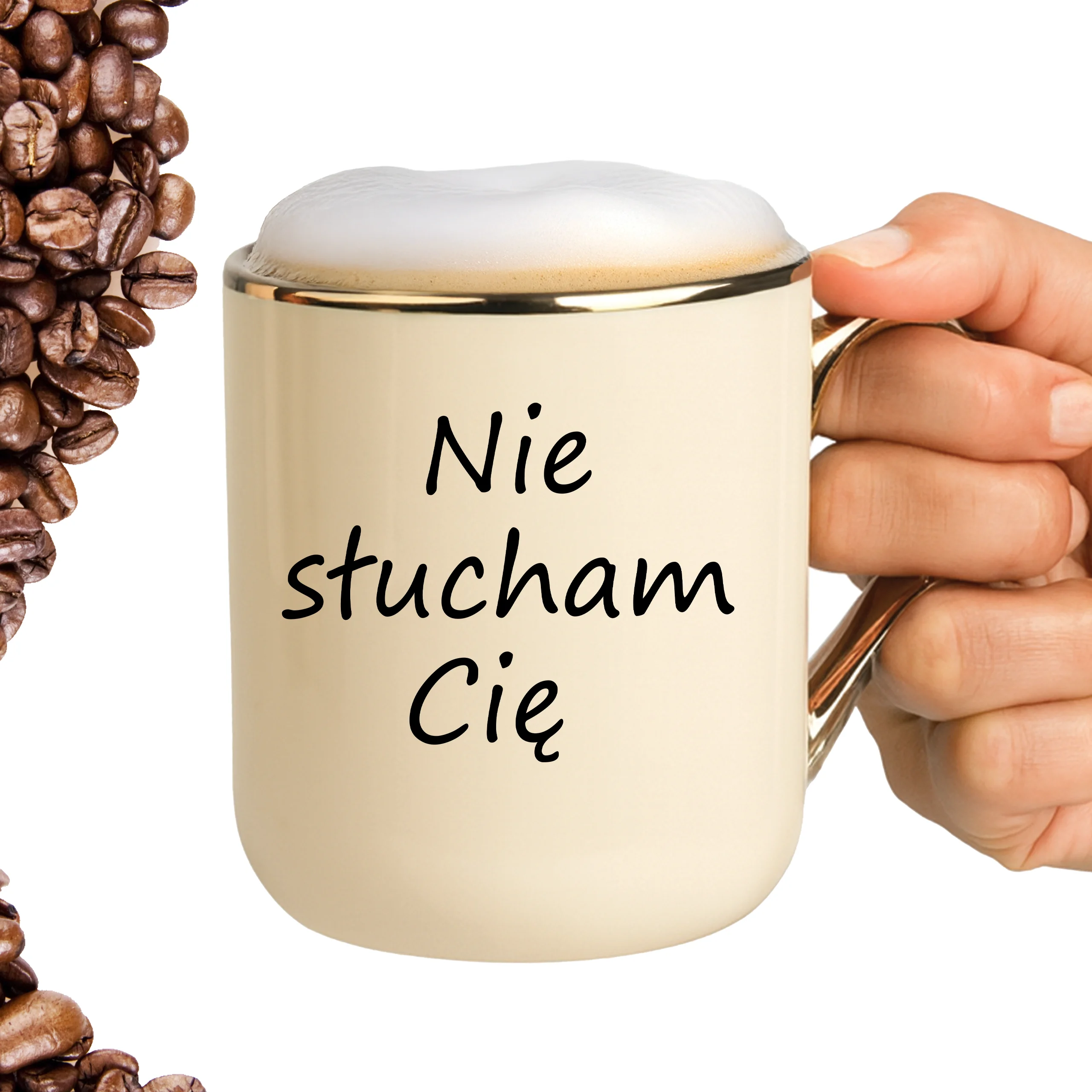 Przepiękny kubek ze złotą rączką oraz rantem z nadrukiem nie słucham cię