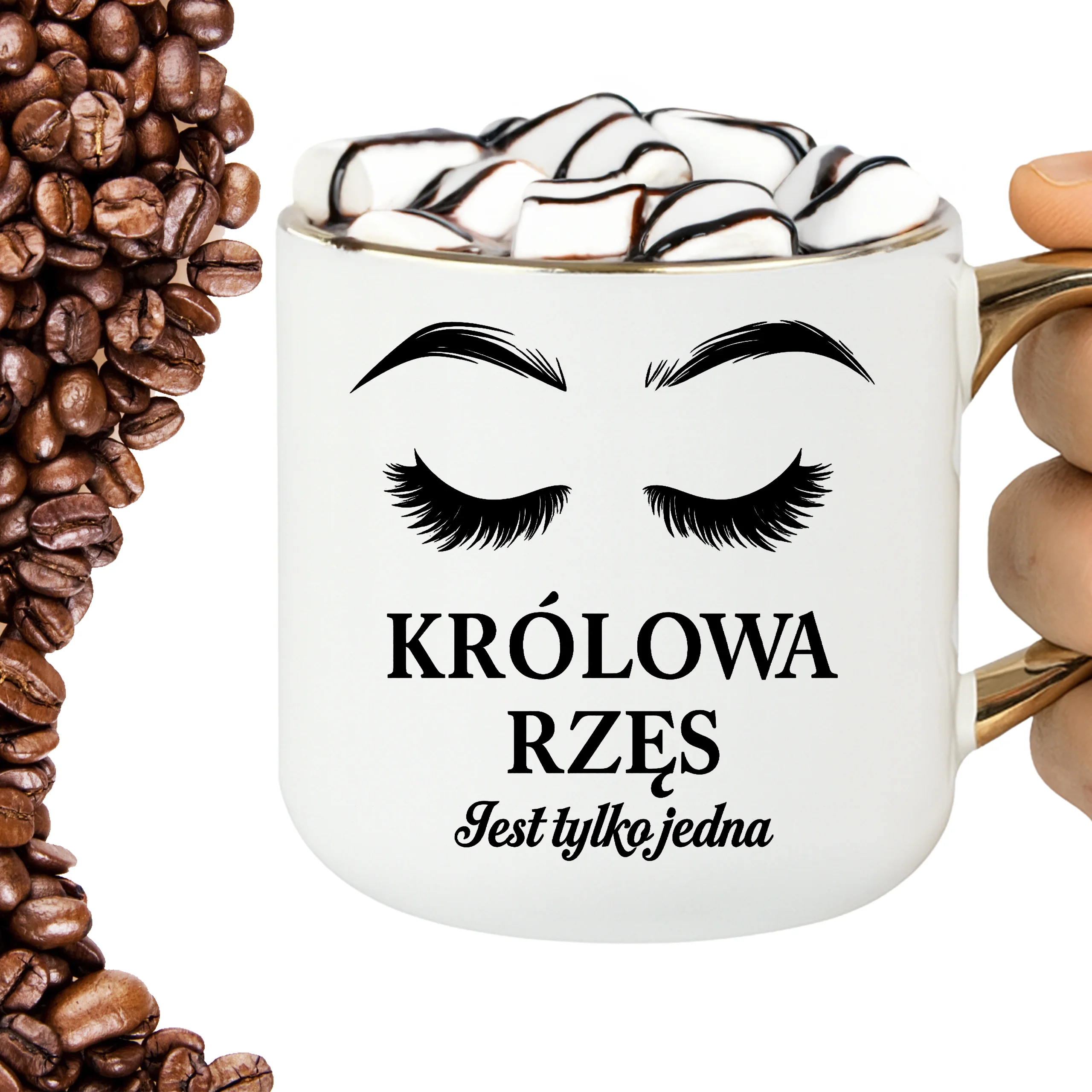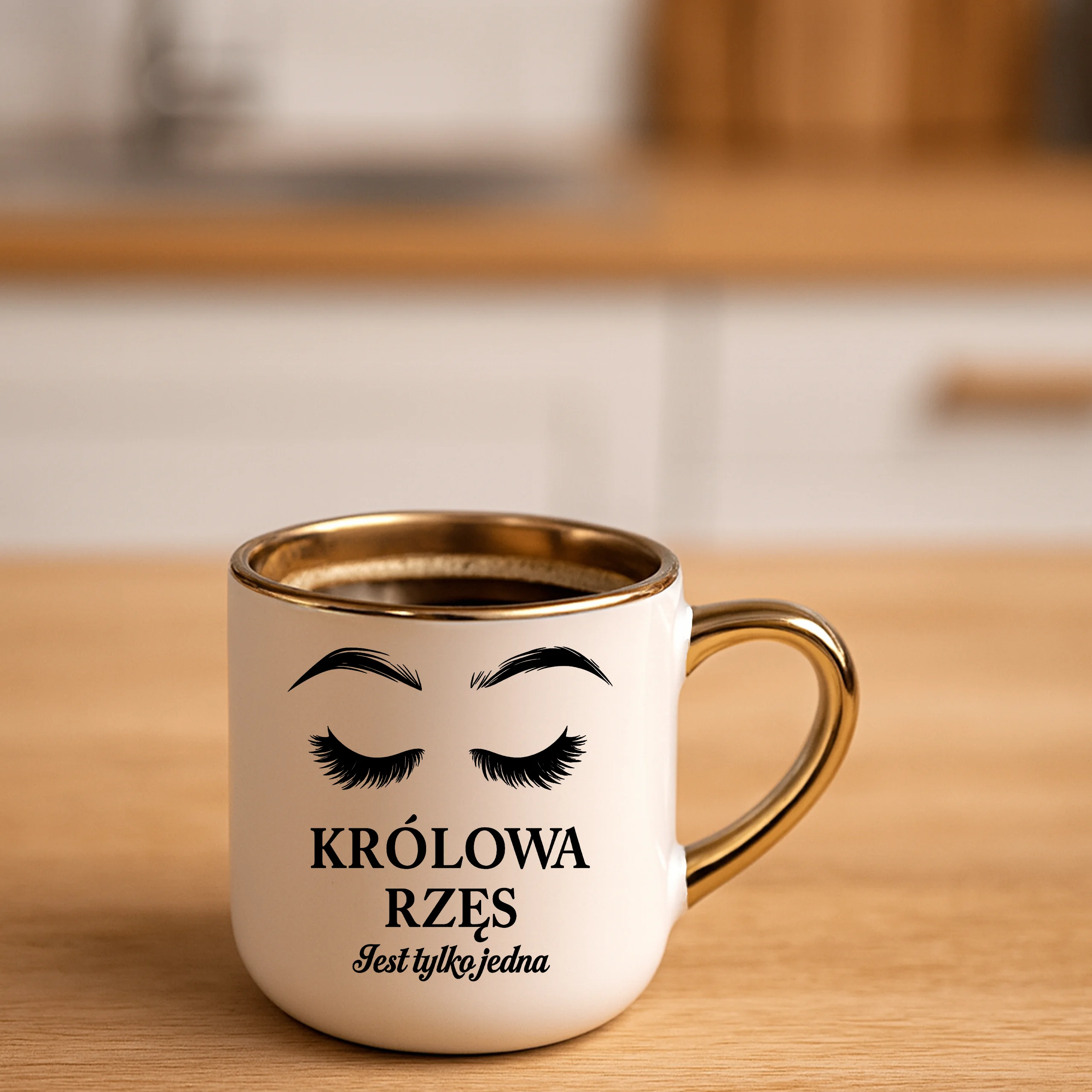 Przepiękny kubek ze złotą rączką oraz rantem z nadrukiem królowa rzęs