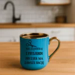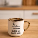 Przepiękny kubek ze złotą rączką oraz rantem z nadrukiem nie zadzieraj z fryzjerem fryzjer ma zawsze rację