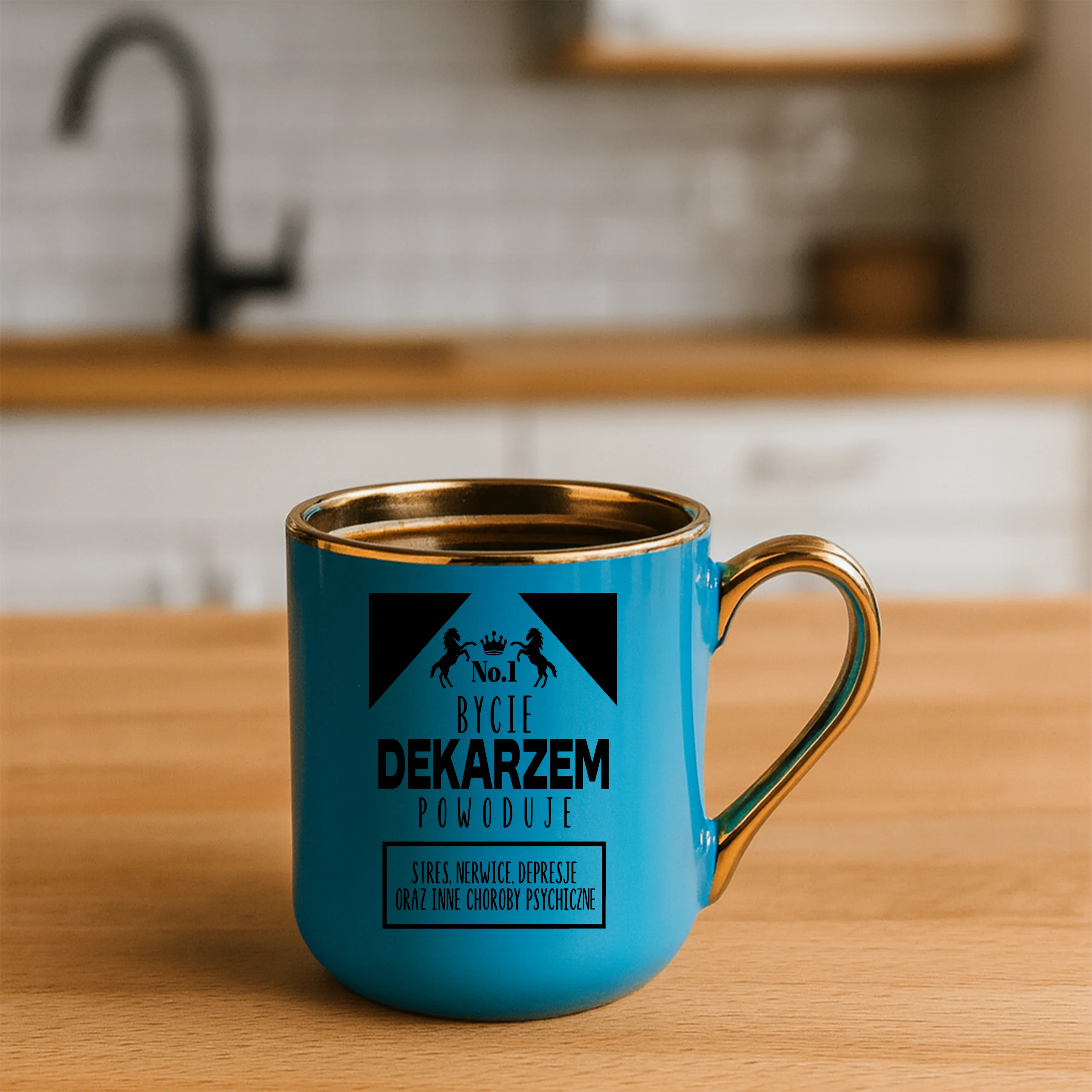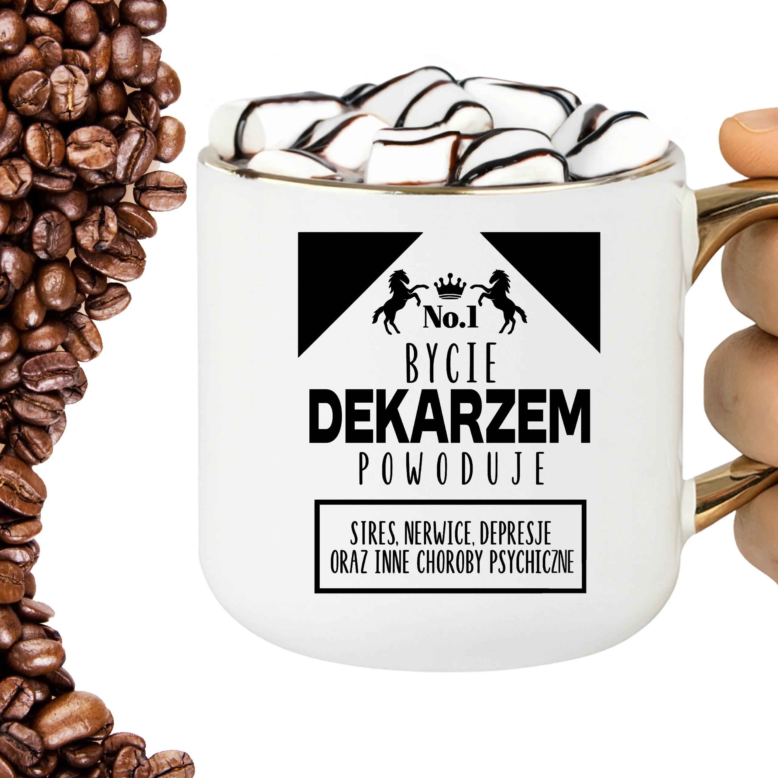 Przepiękny kubek ze złotą rączką oraz rantem z nadrukiem bycie dekarzem powoduje stres nerwice depresje oraz inne choroby psychiczne