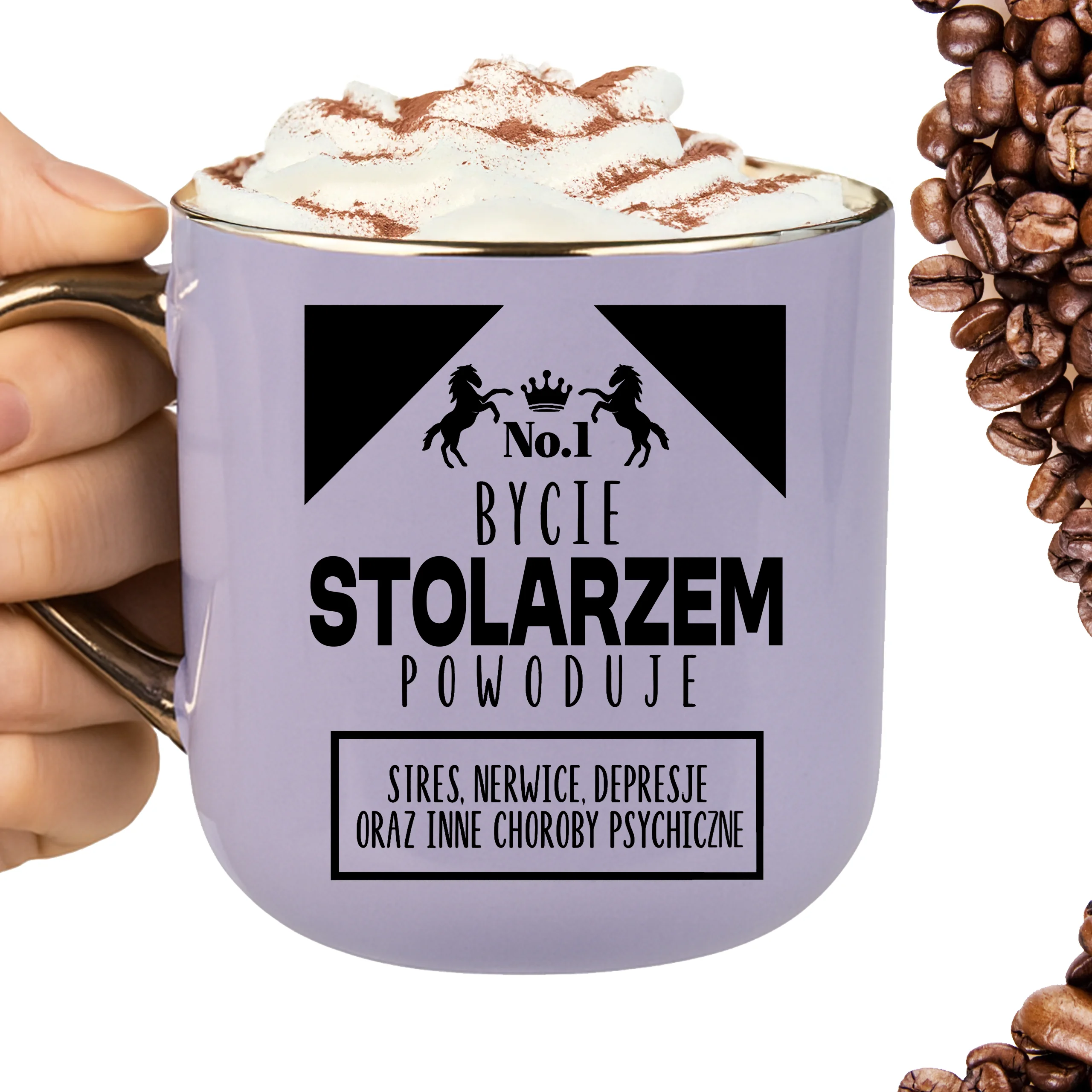 Przepiękny kubek ze złotą rączką oraz rantem z nadrukiem bycie stolarzem powoduje stres nerwice depresje oraz inne choroby psychiczne