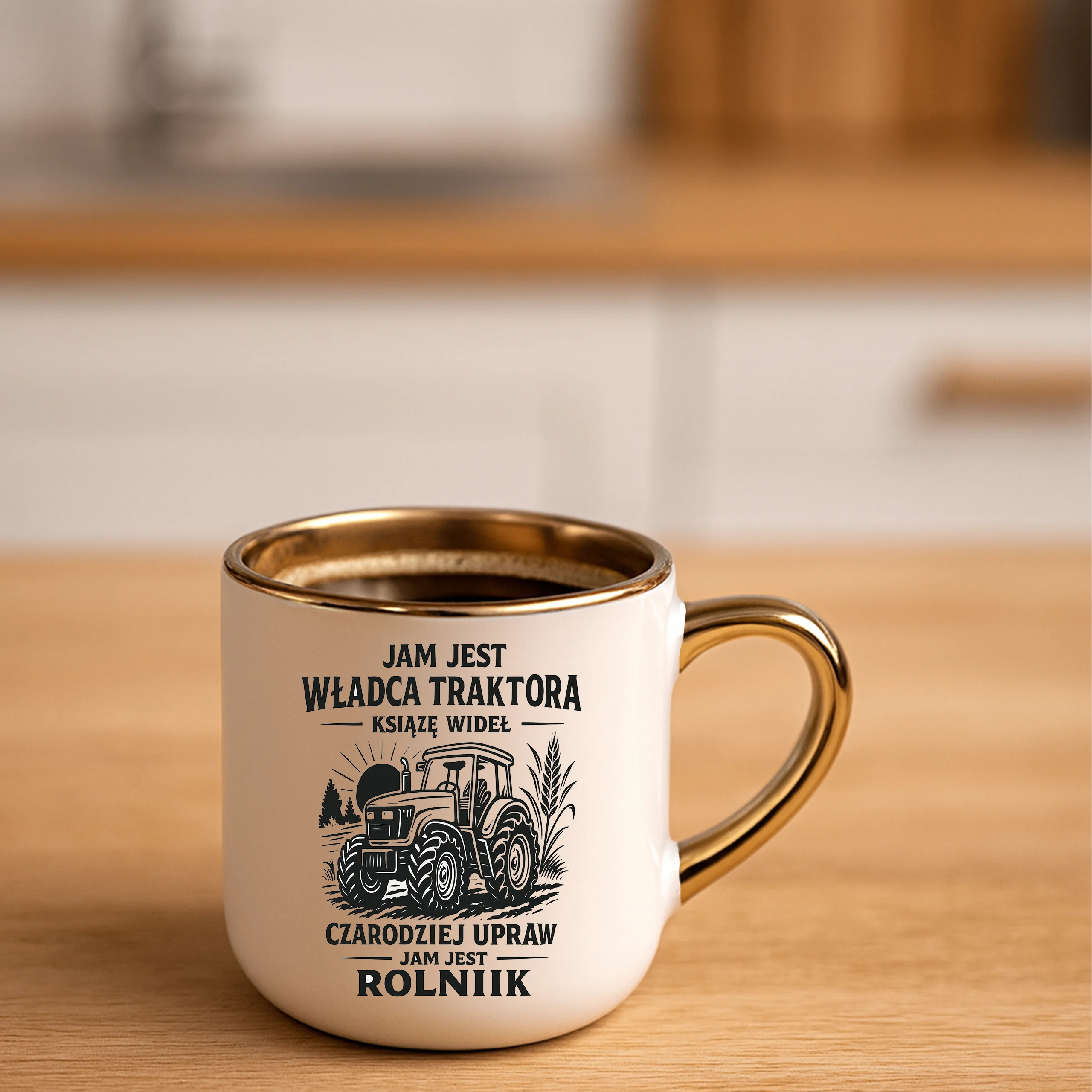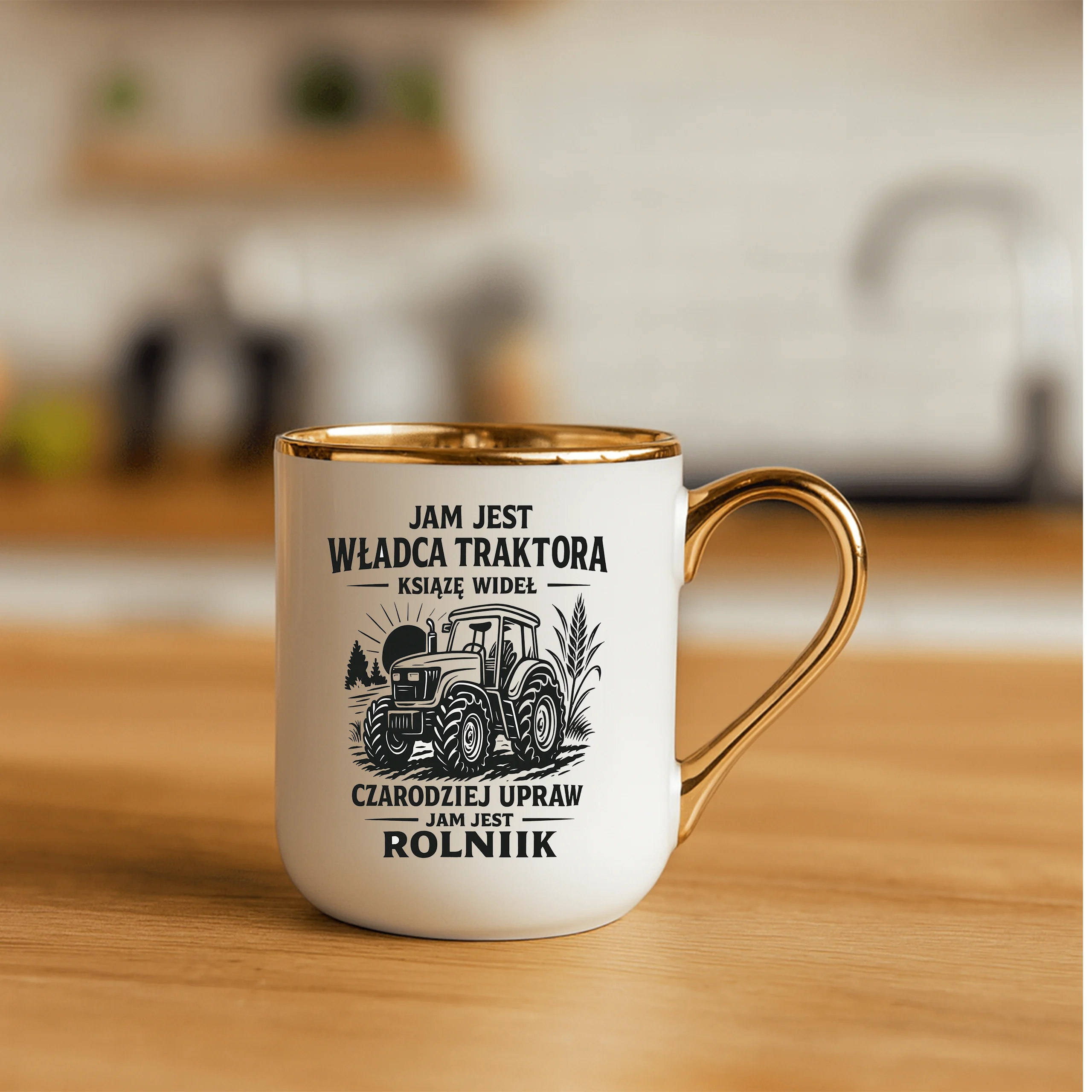 Przepiękny kubek ze złotą rączką oraz rantem z nadrukiem am jest władca traktora książe wideł czarodziej upraw jam jest rolnik