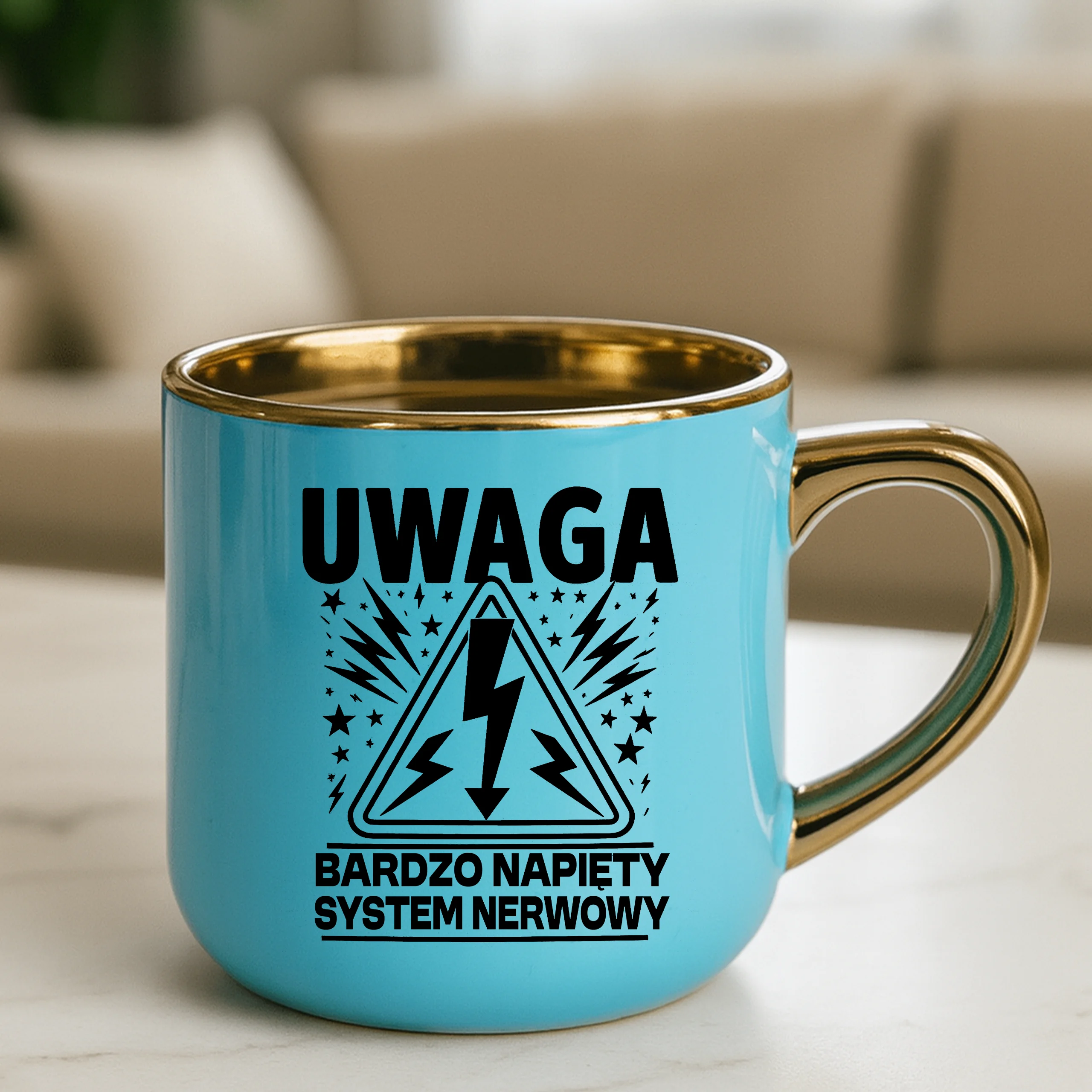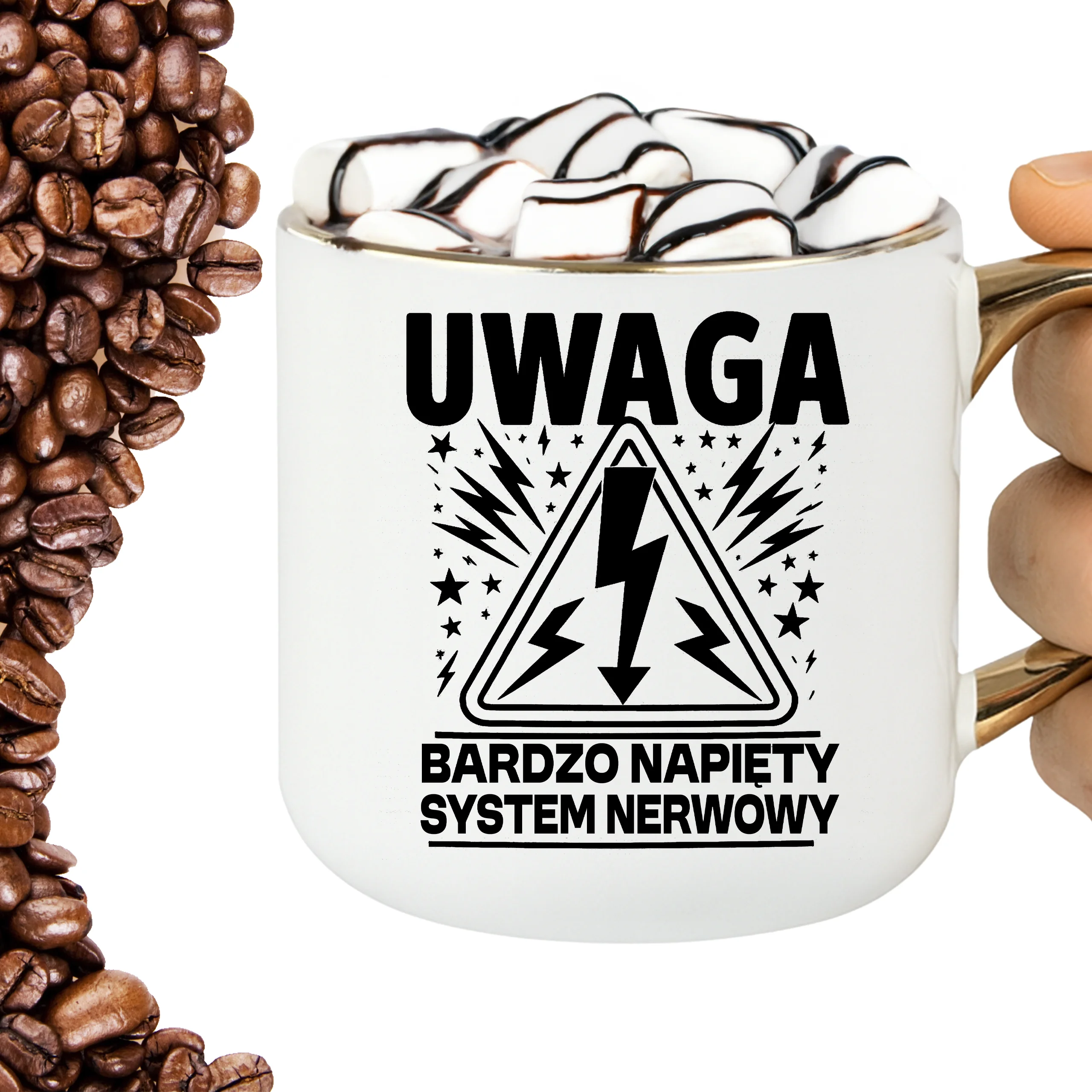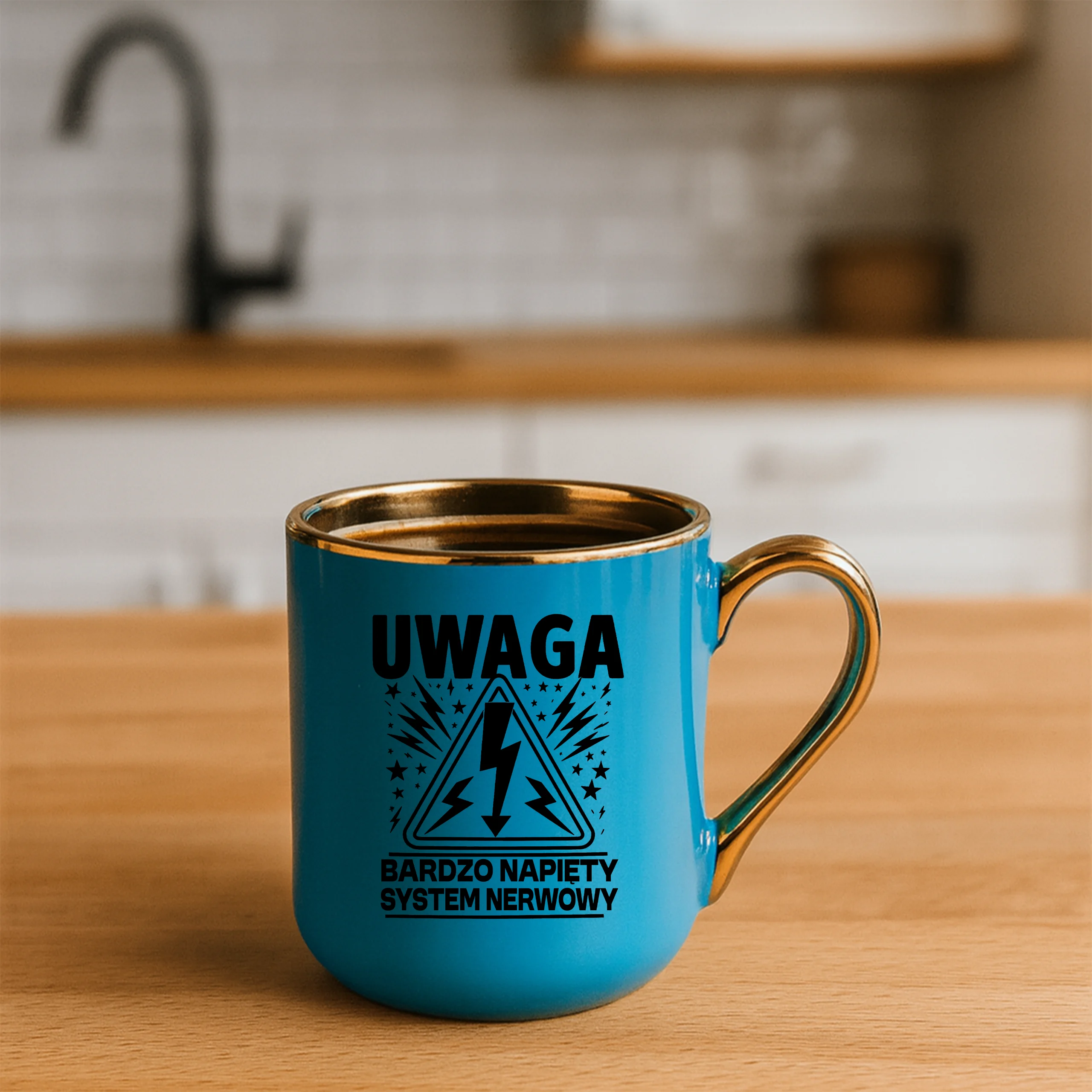Przepiękny kubek ze złotą rączką oraz rantem z nadrukiem uwaga bardzo napięty system