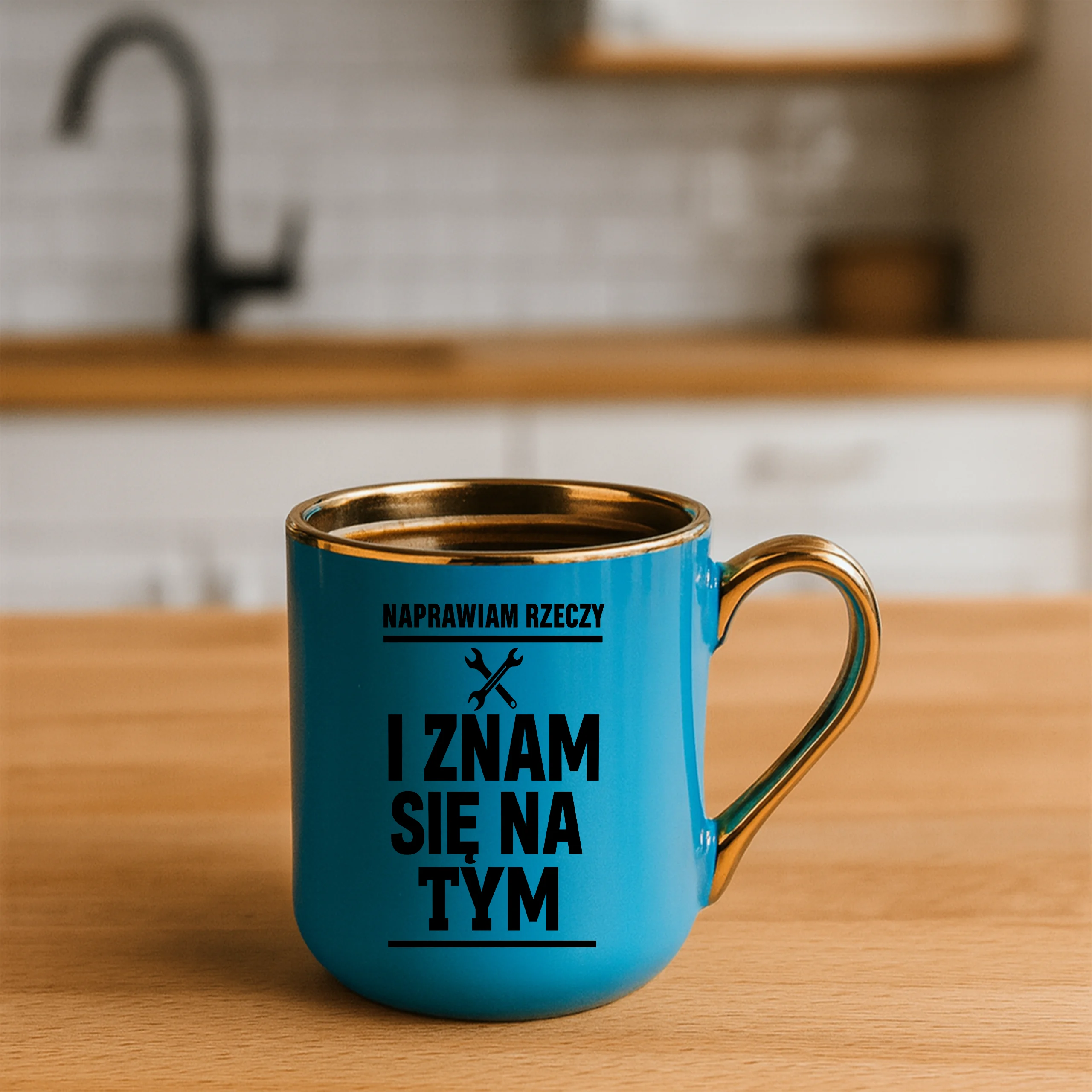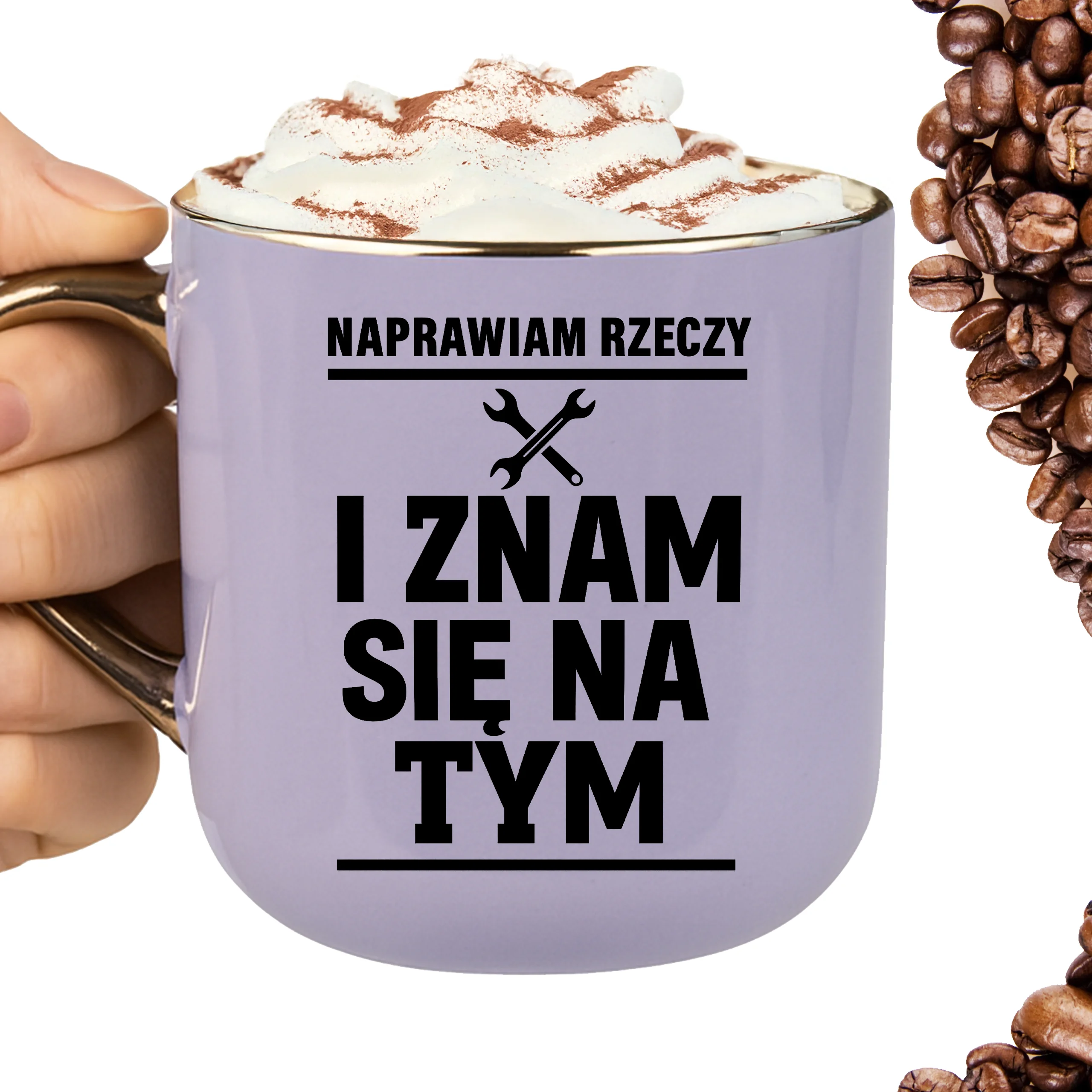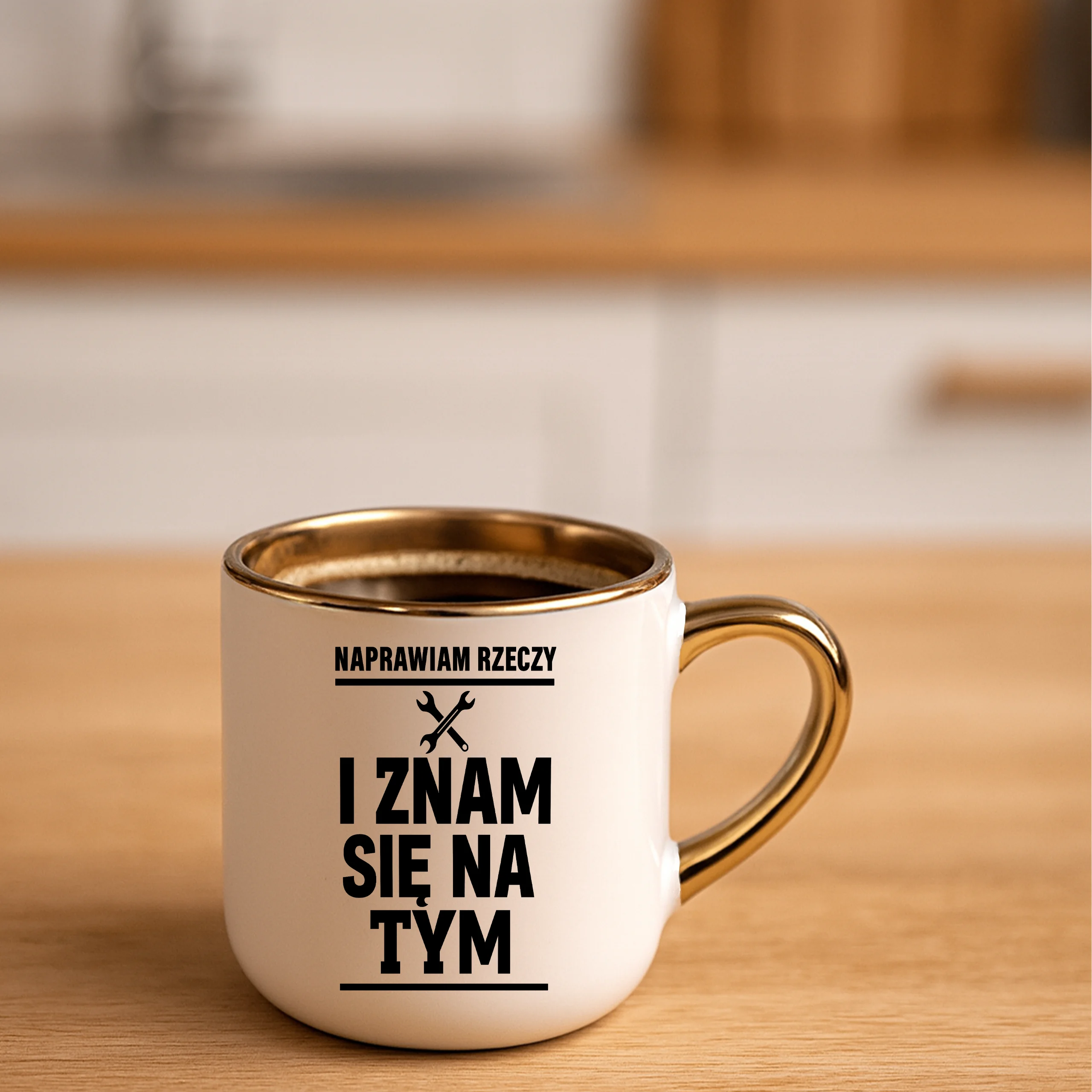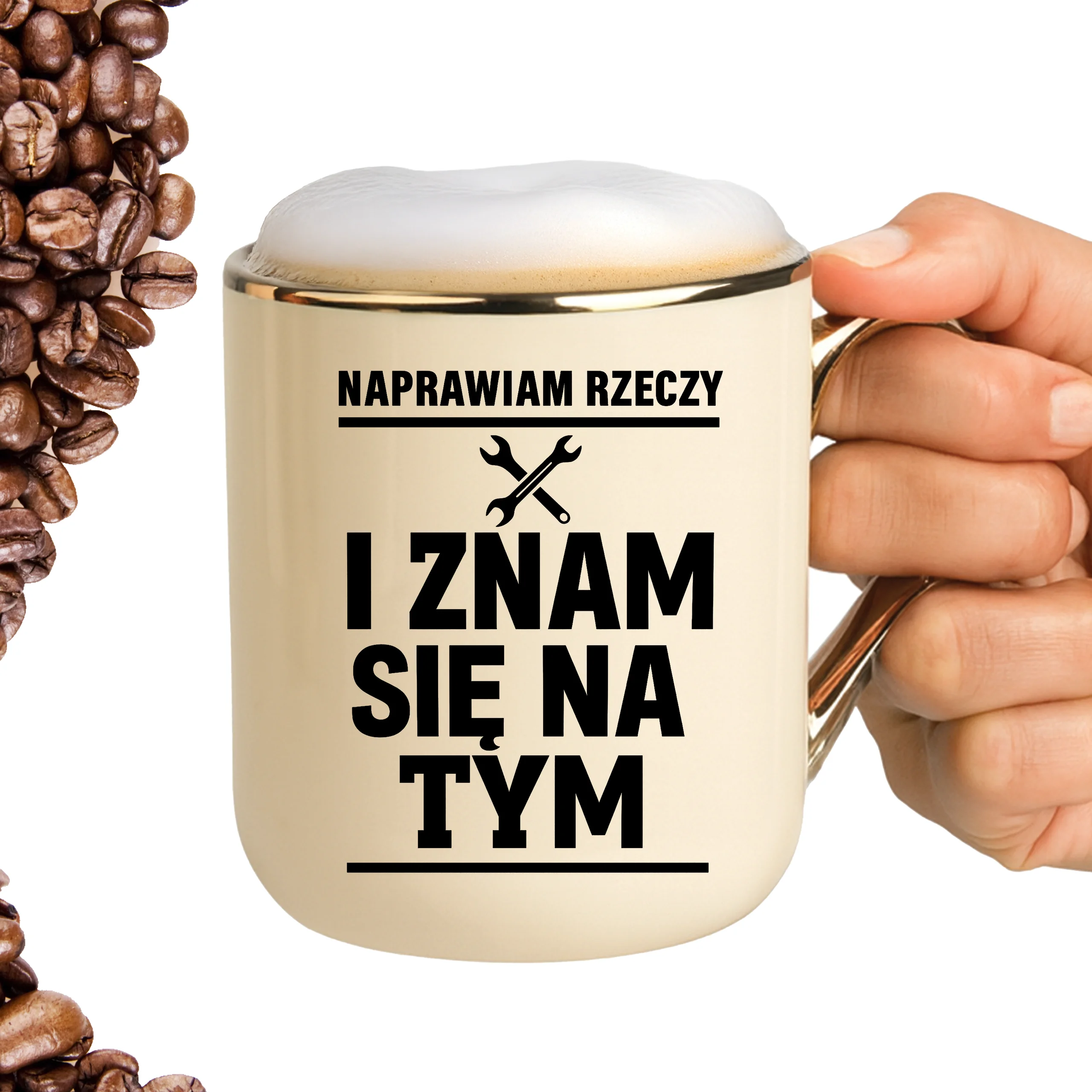 Przepiękny kubek ze złotą rączką oraz rantem z nadrukiem naprawiam rzeczy i znam się na tym