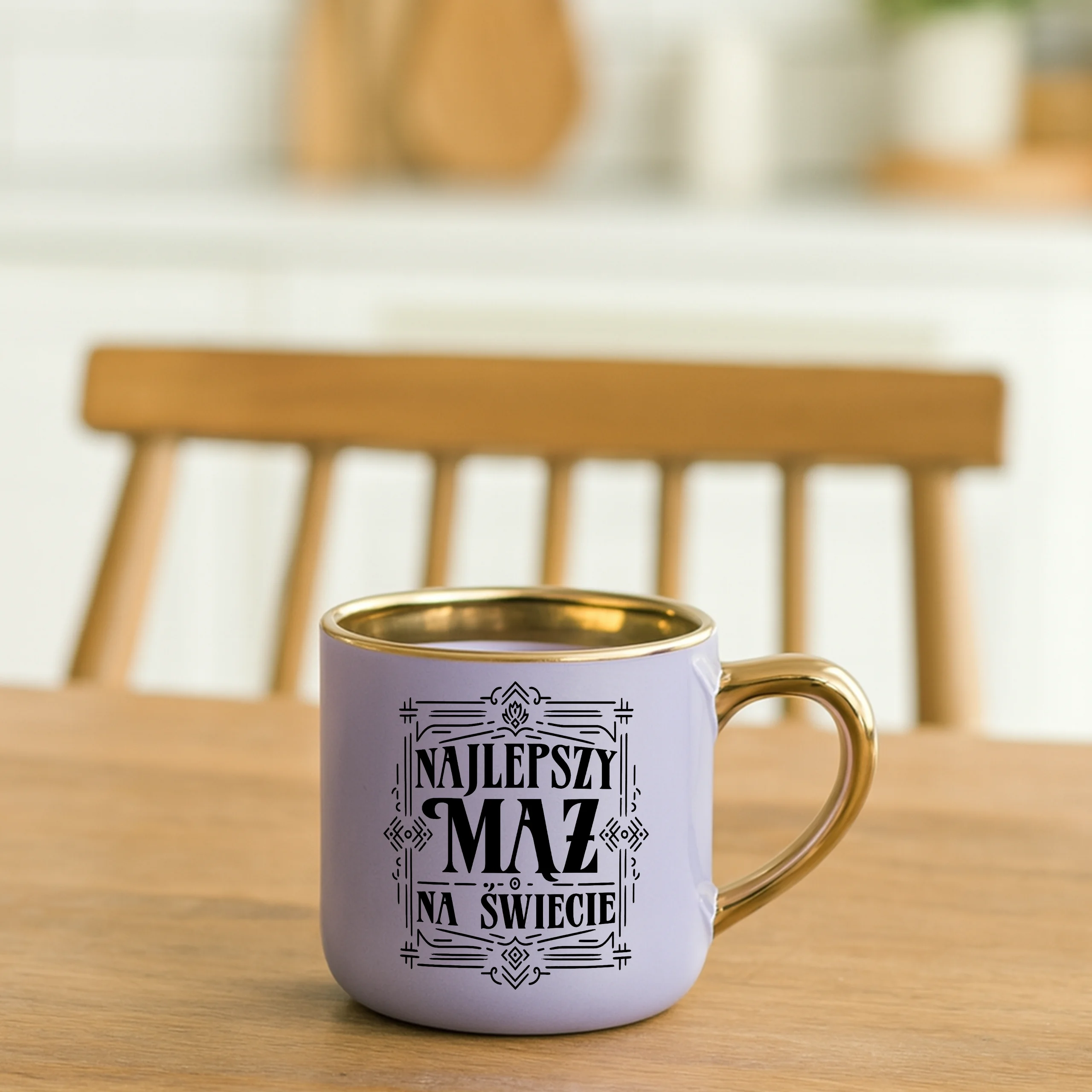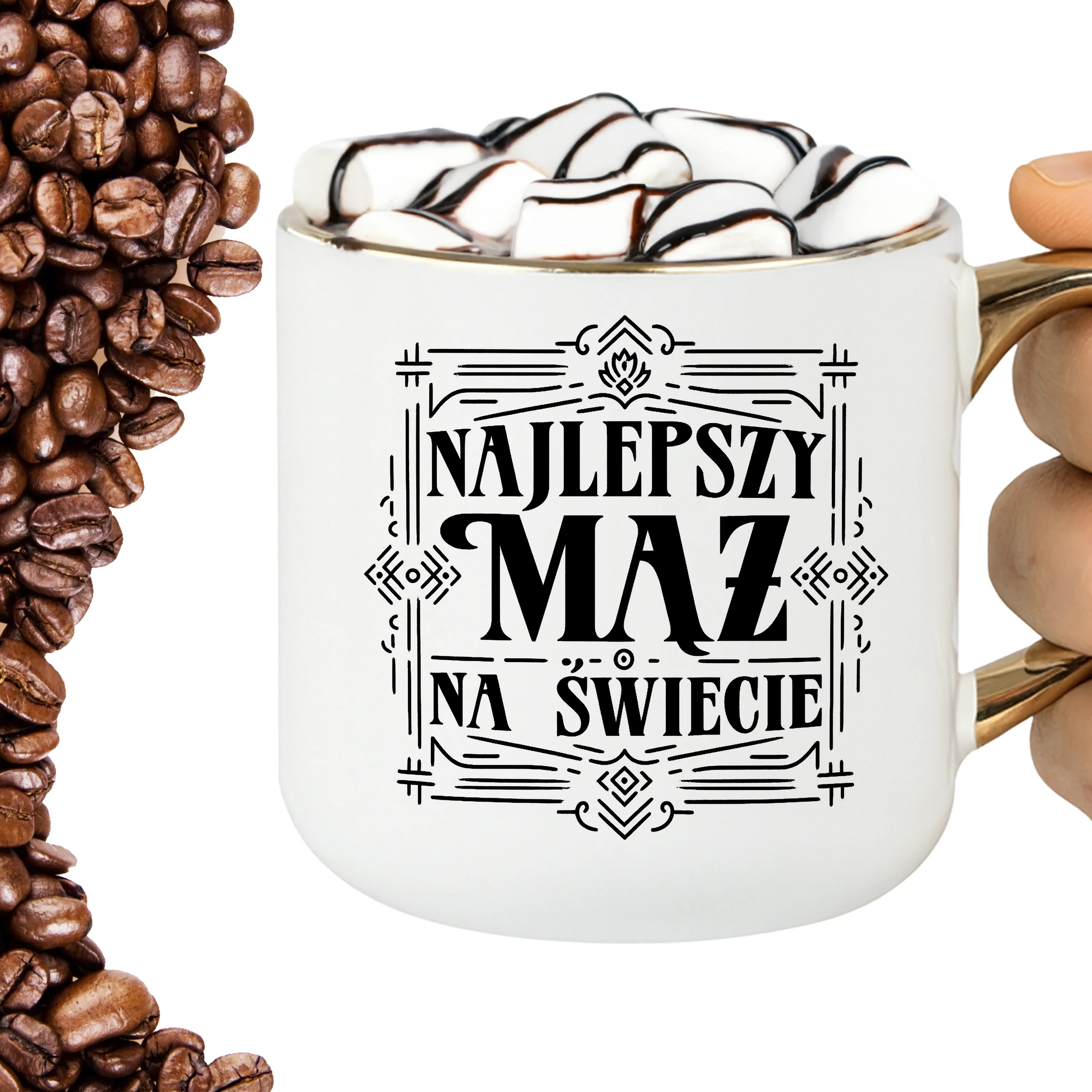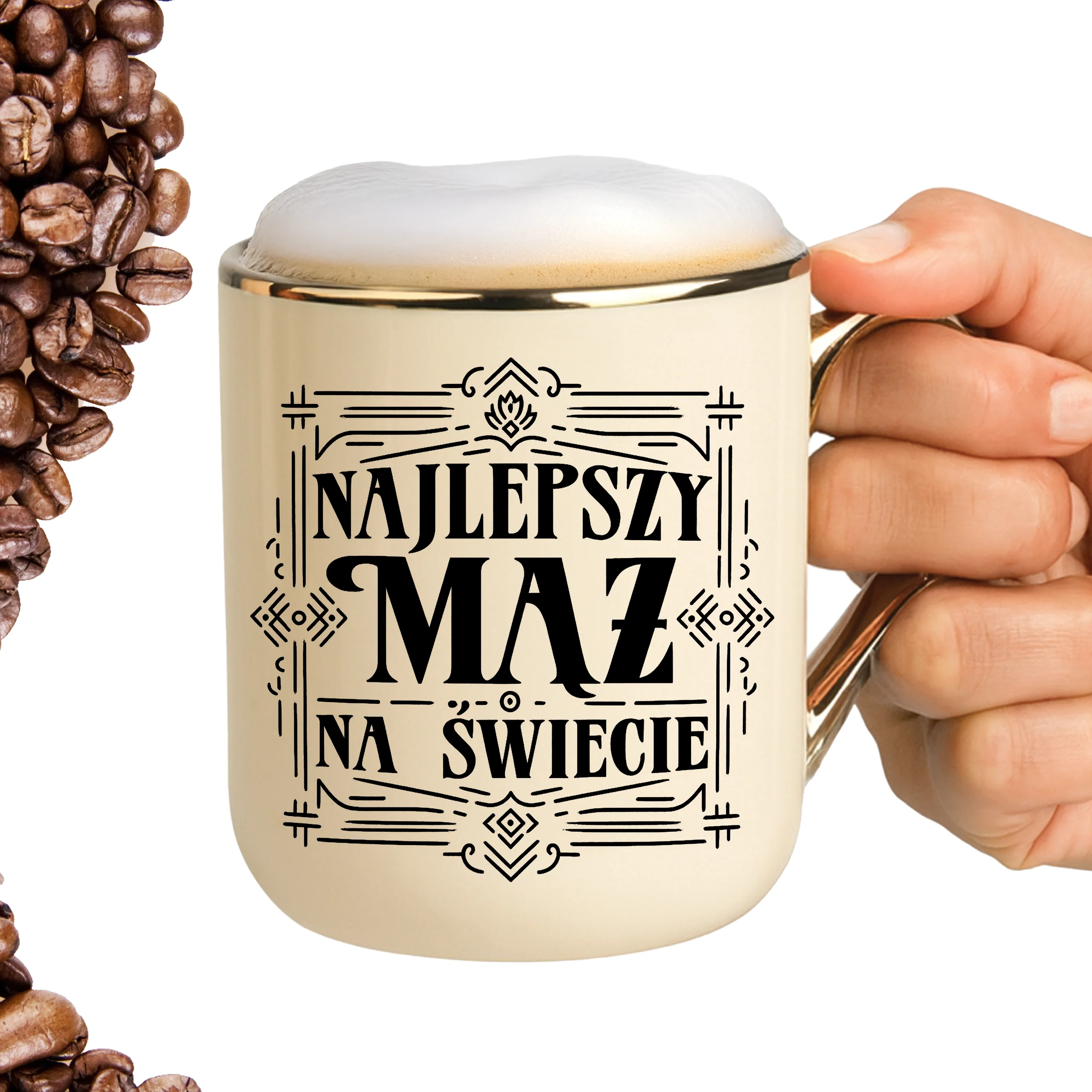 Przepiękny kubek ze złotą rączką oraz rantem z nadrukiem najlepszy mąż na świecie