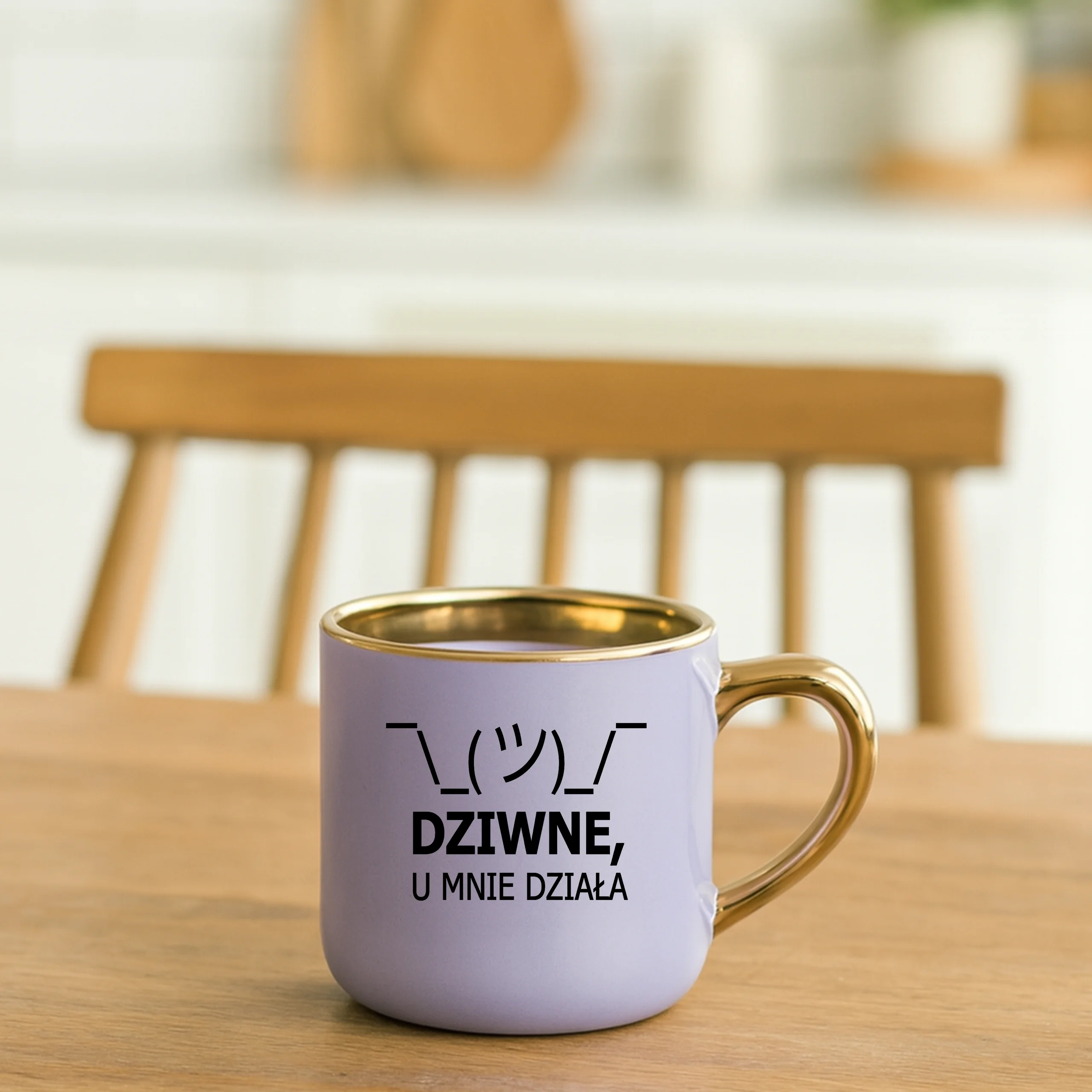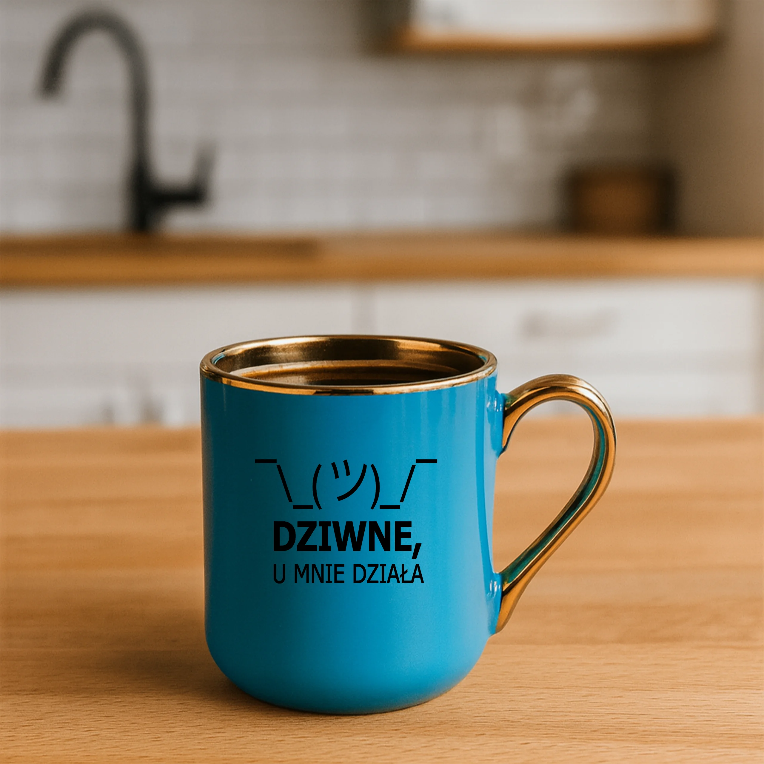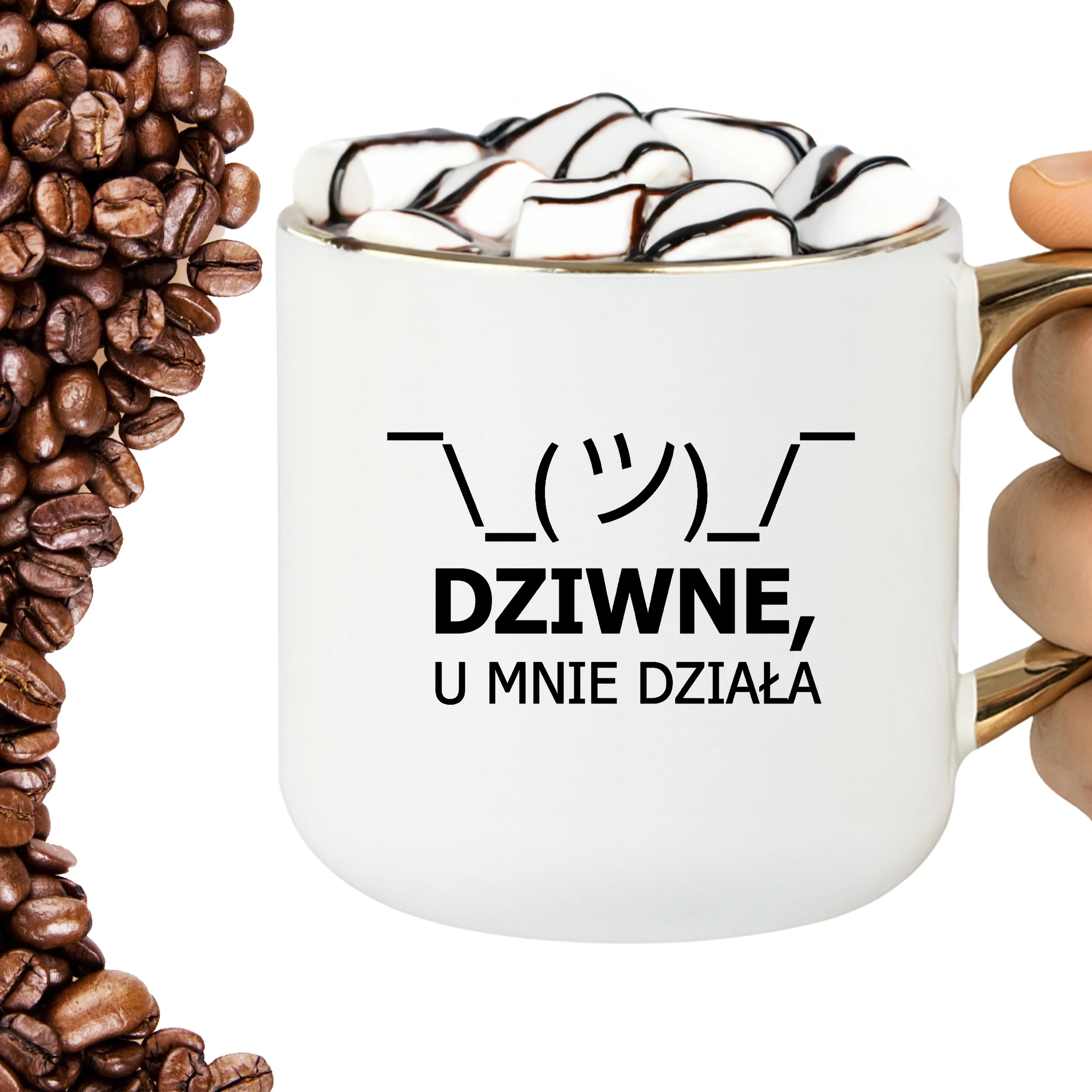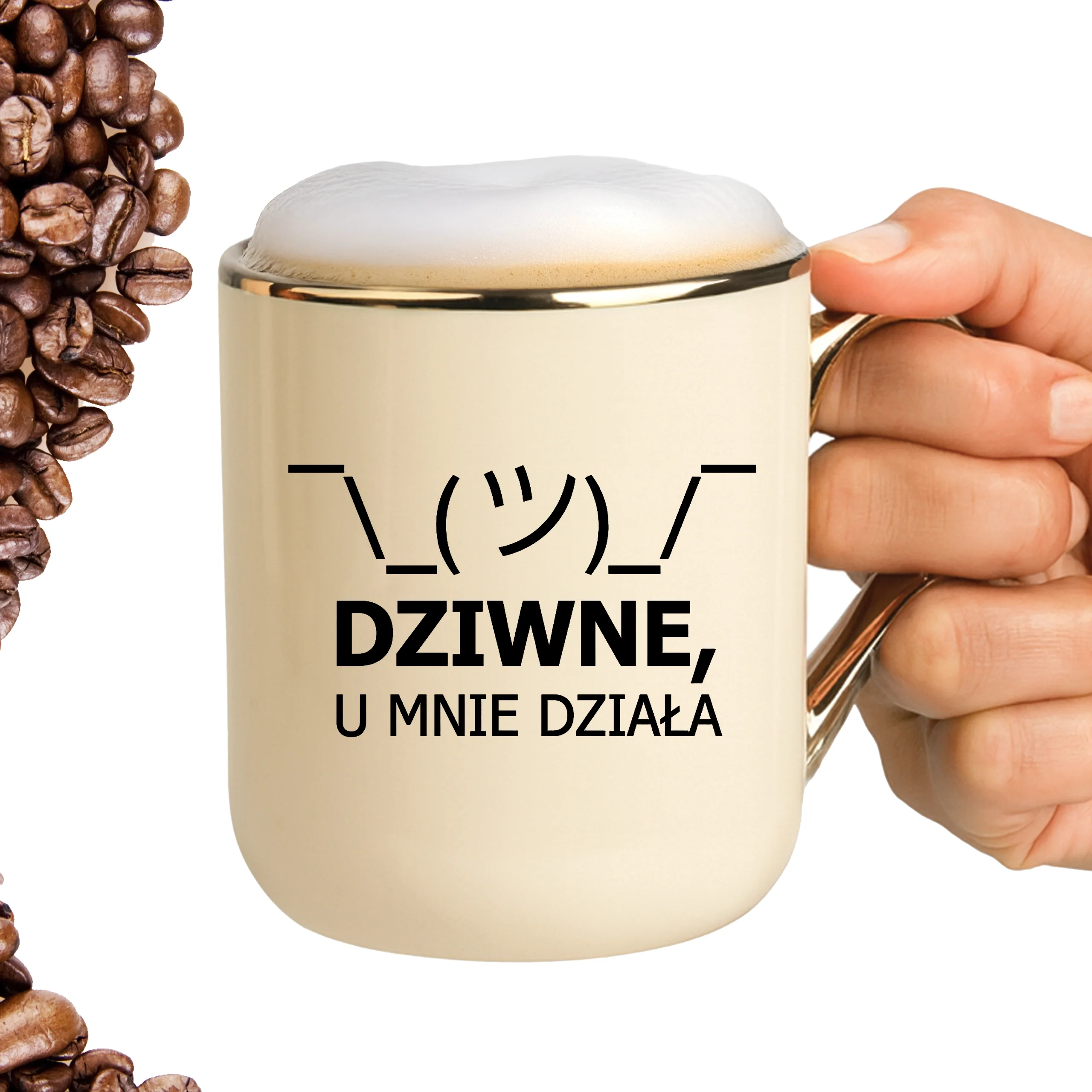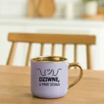 Przepiękny kubek ze złotą rączką oraz rantem z nadrukiem dziwne u mnie działa