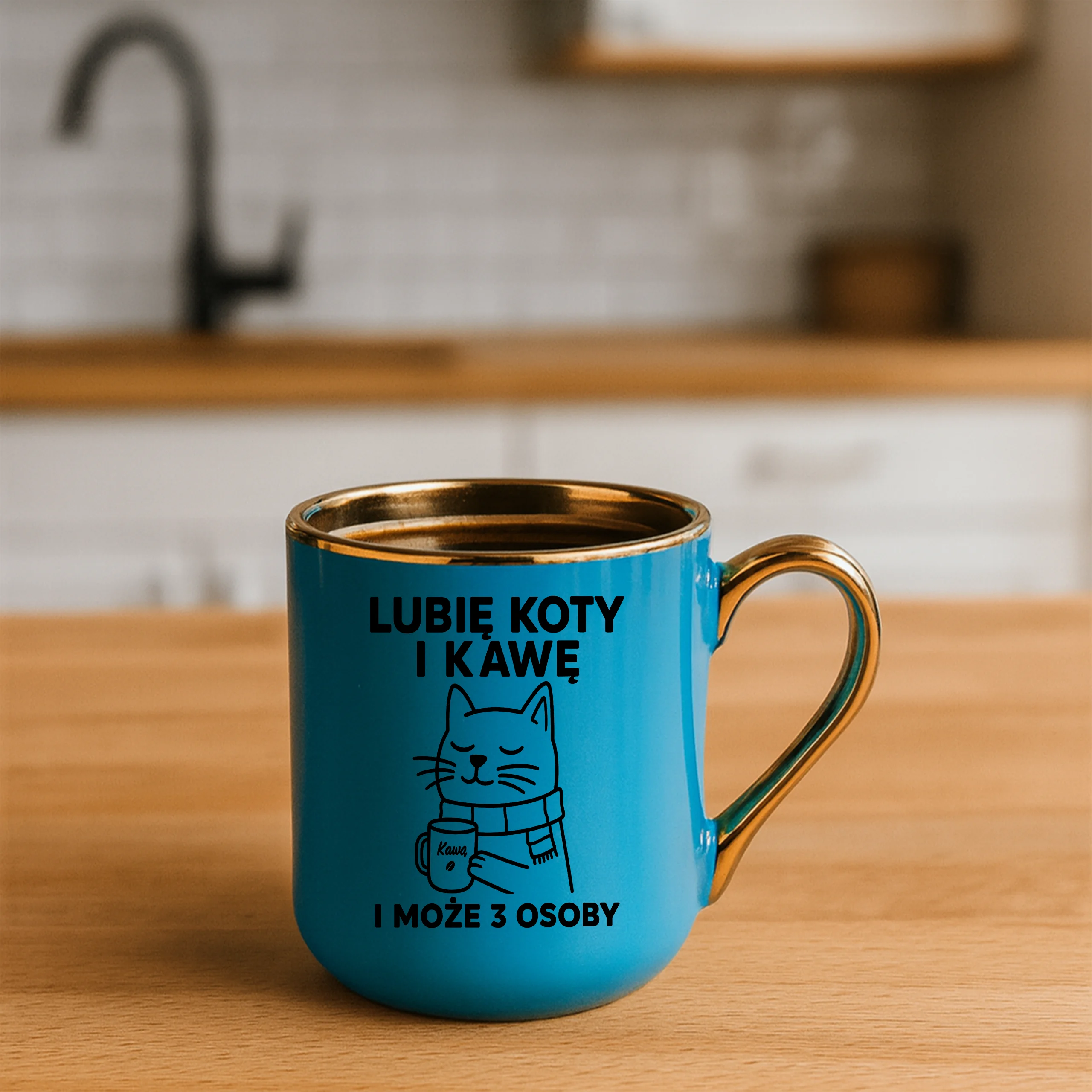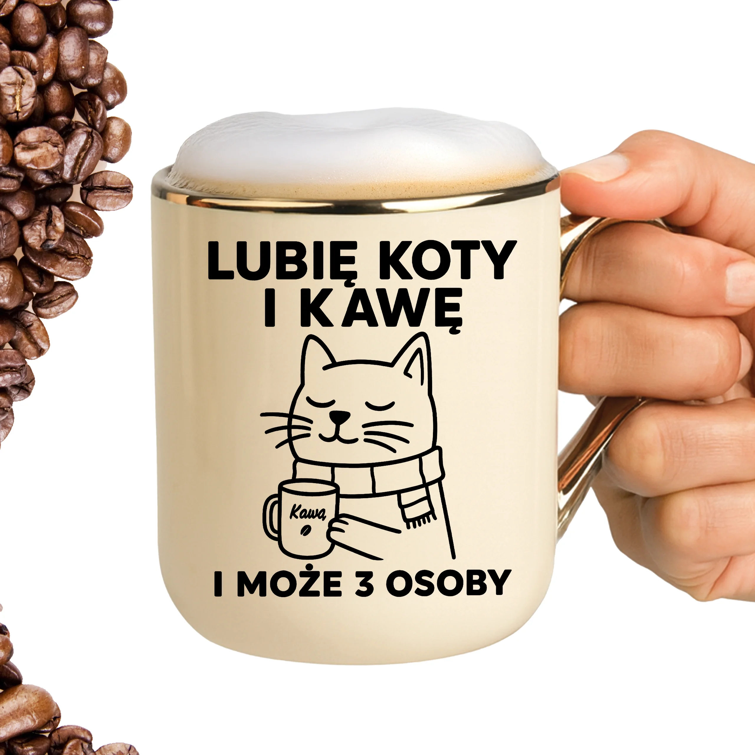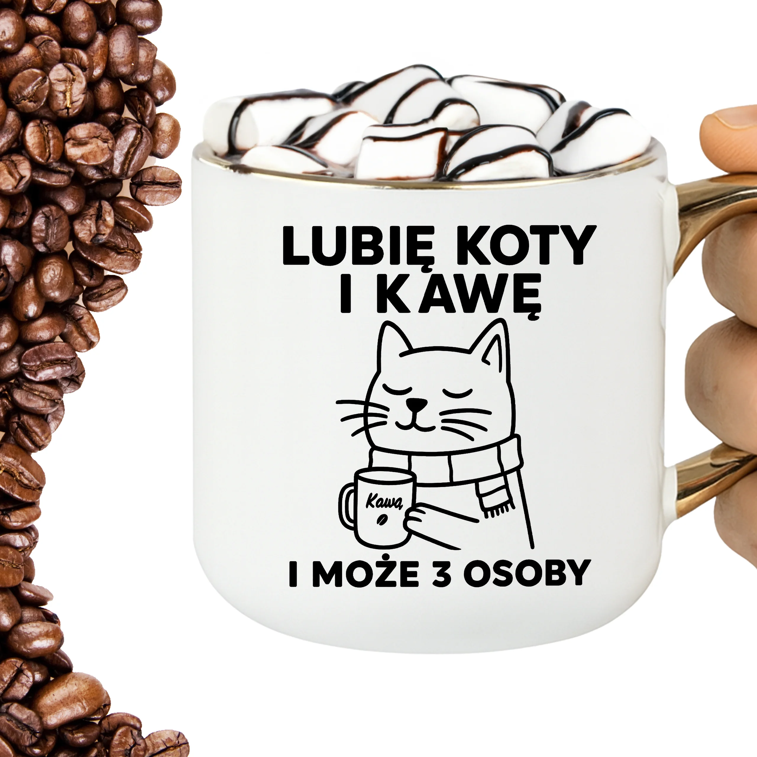 Przepiękny kubek ze złotą rączką oraz rantem z nadrukiem lubię koty i kawę i może z 3 osoby