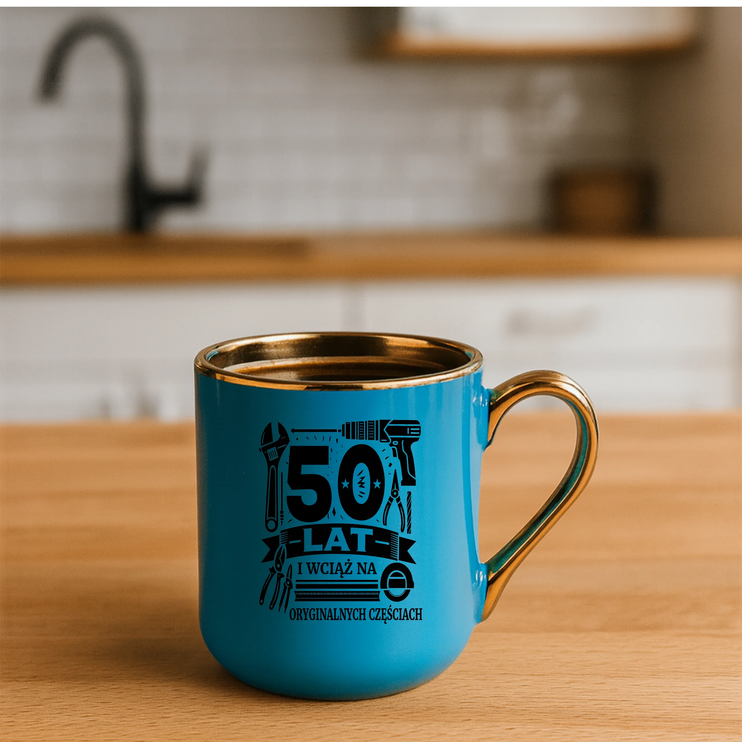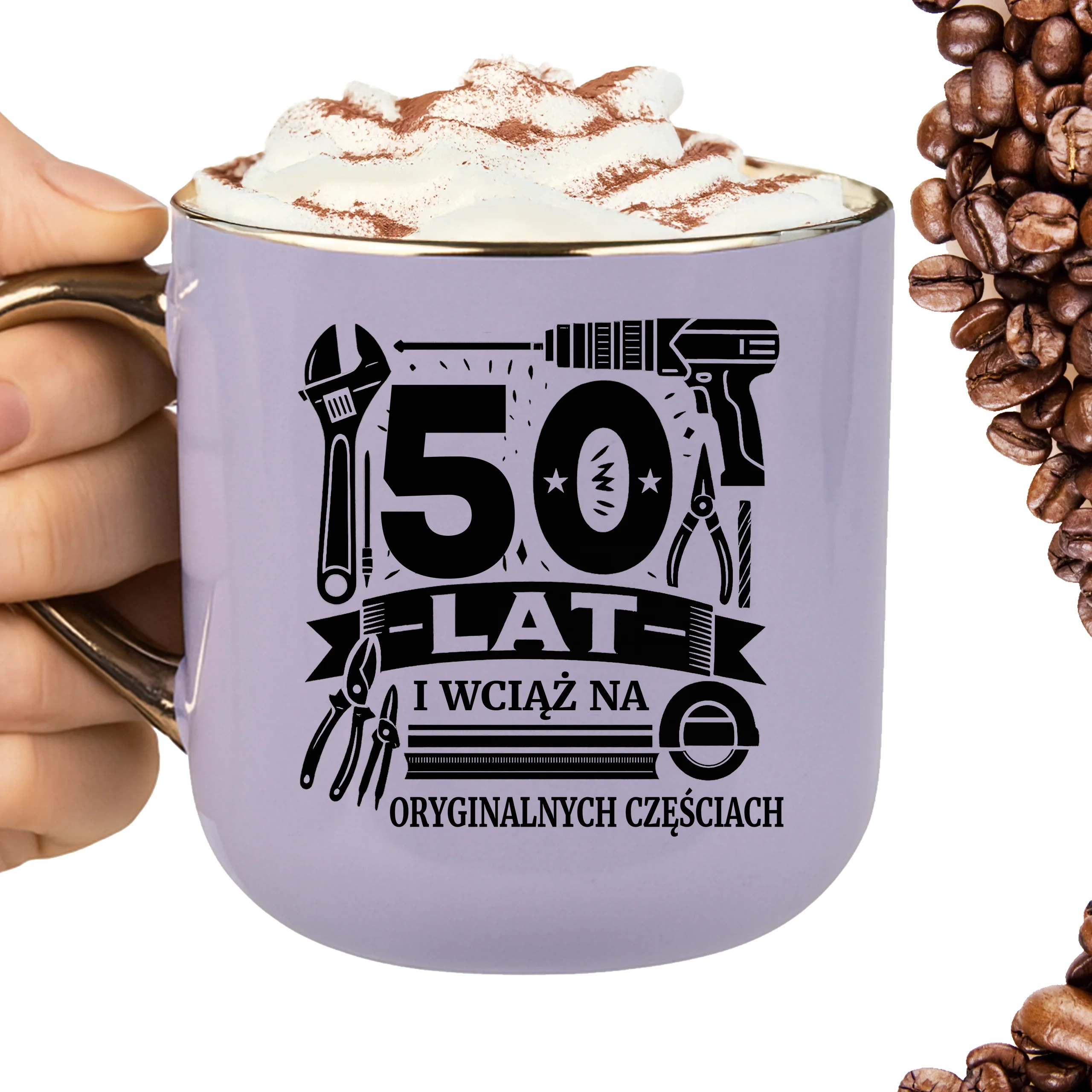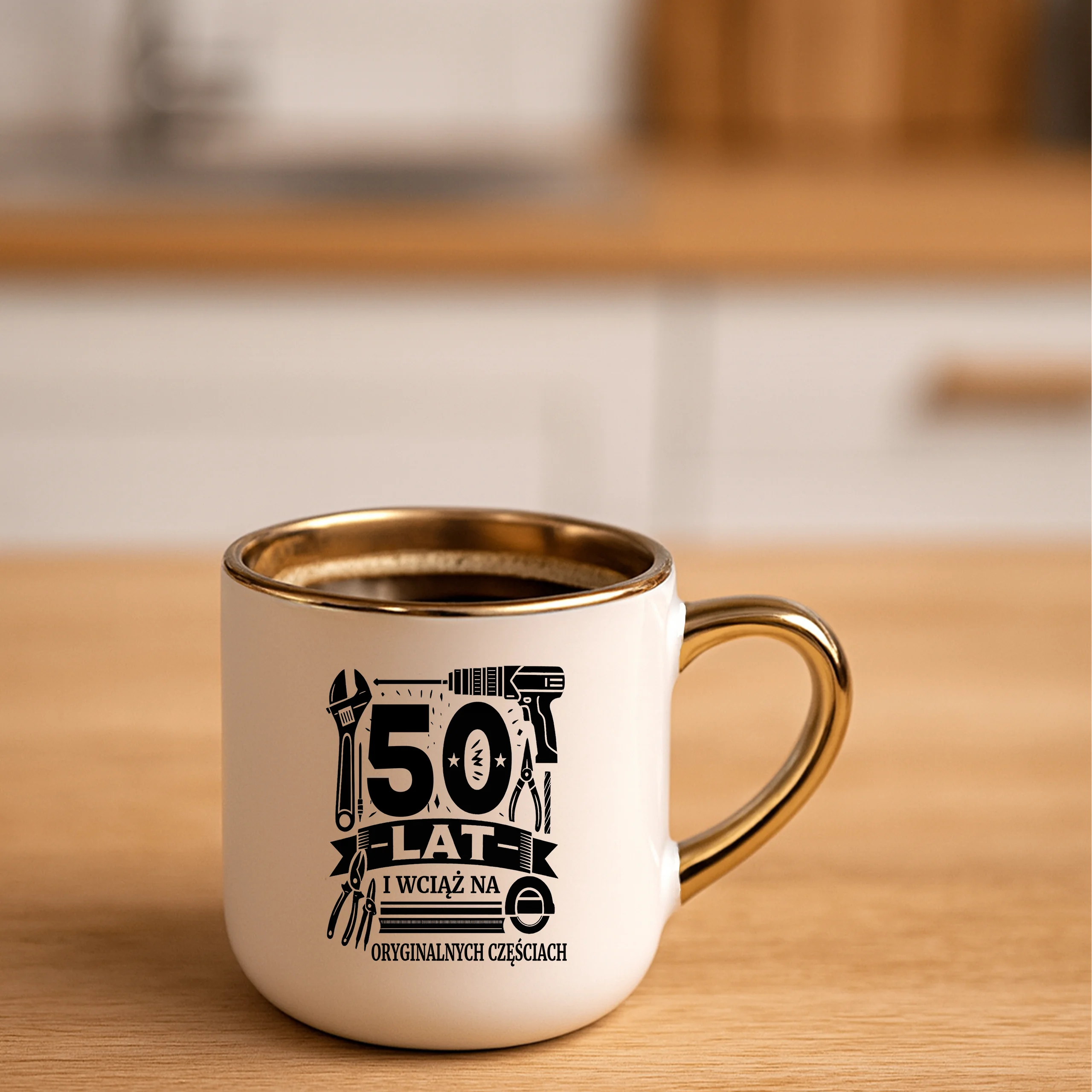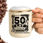Przepiękny kubek ze złotą rączką oraz rantem z nadrukiem50 lat i wciąż na oryginalnych częściach