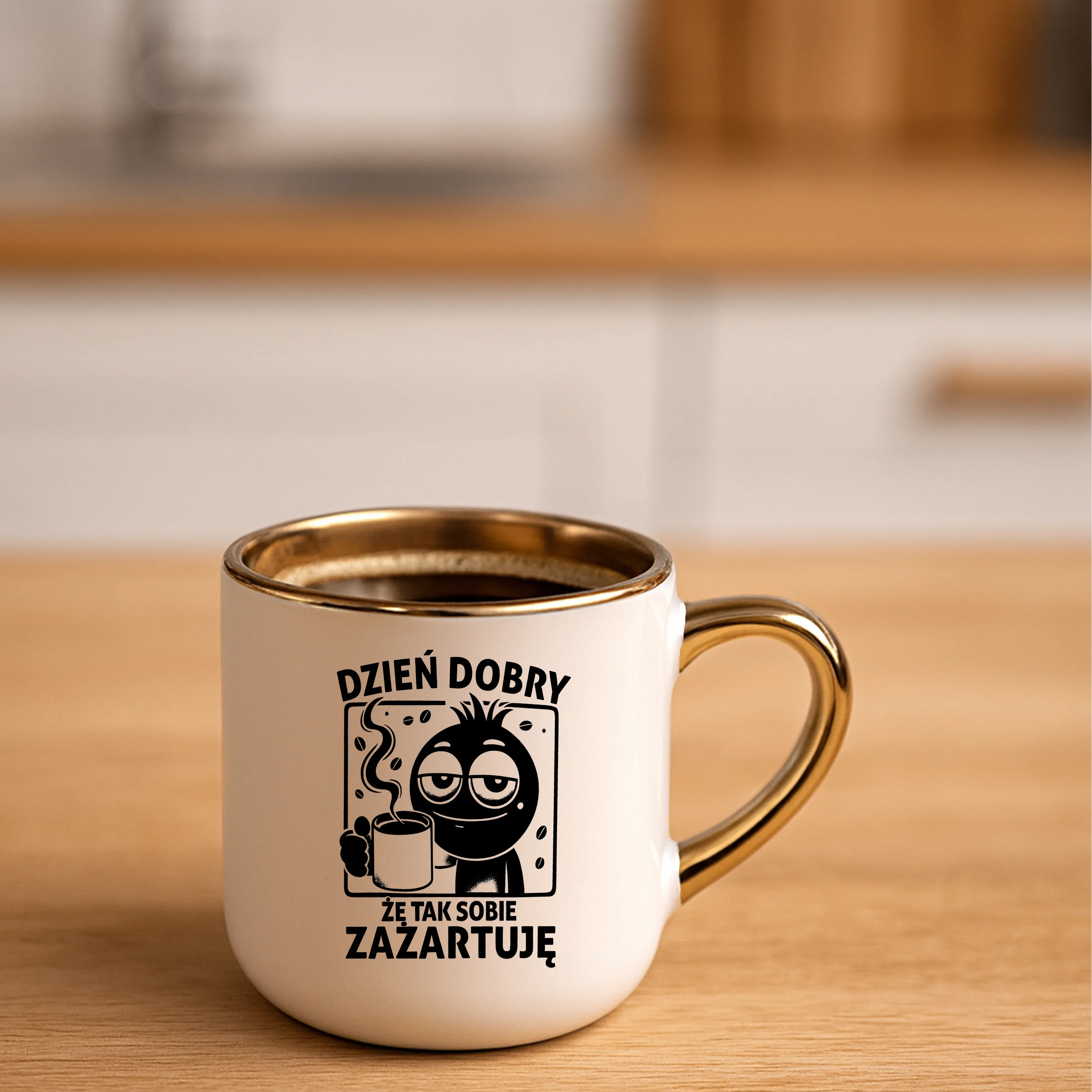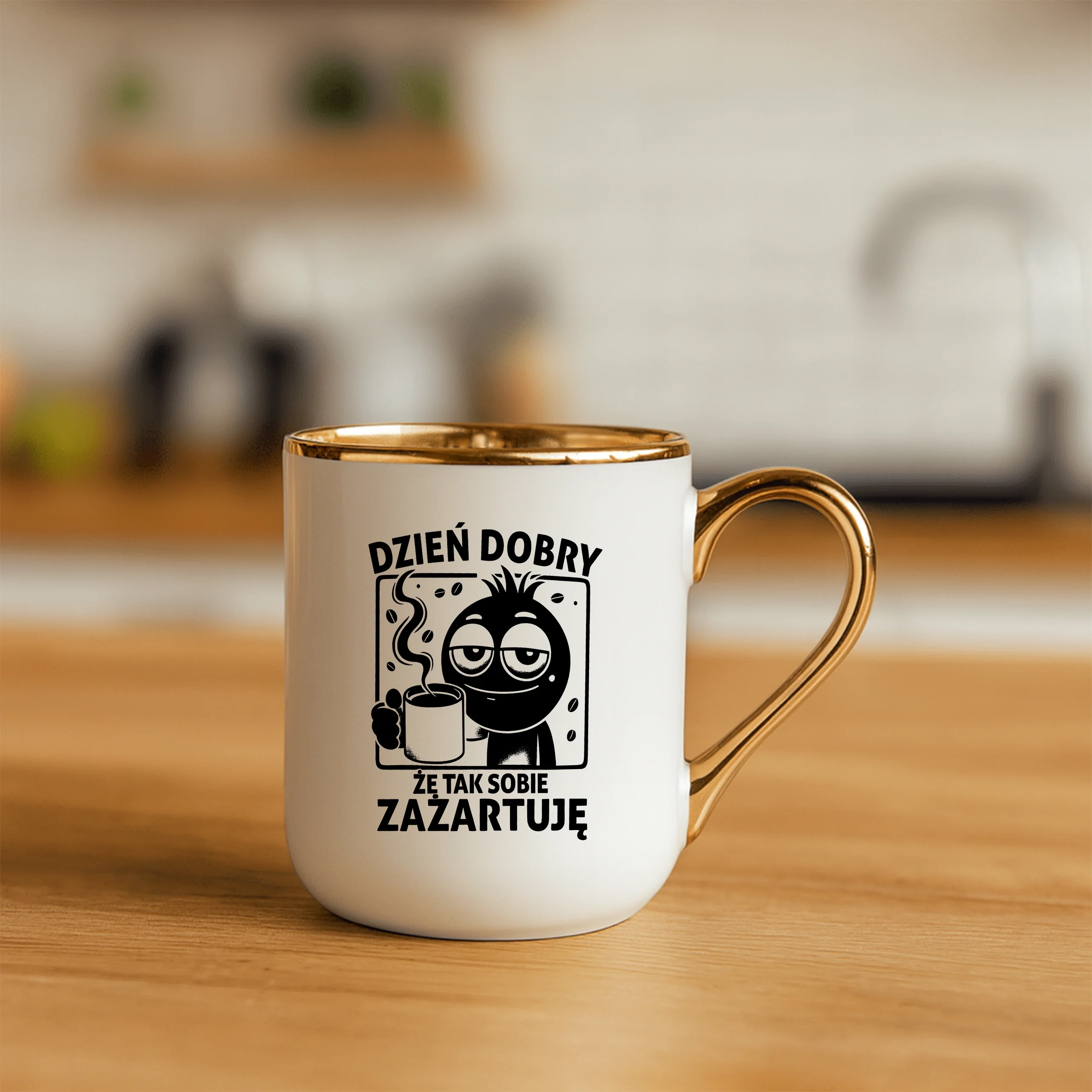 Przepiękny kubek ze złotą rączką oraz rantem z nadrukiem dzień dobry że tak sobie zażartuję