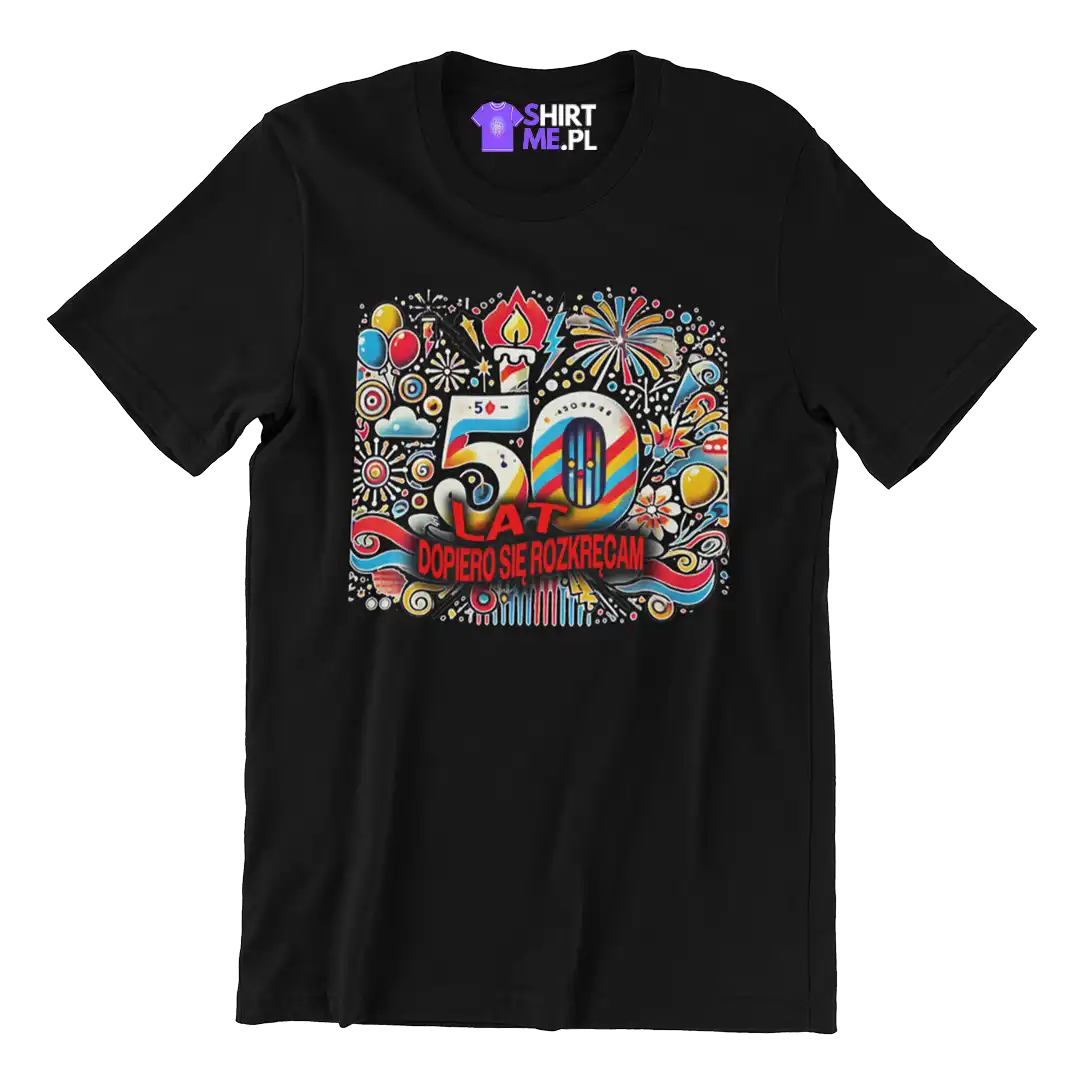 Koszulka na prezent na 50 urodziny dla niego. Śmieszna koszulka na urodziny z nadrukiem- na 50 urodziny- 50 lat dopiero się rozkręcam