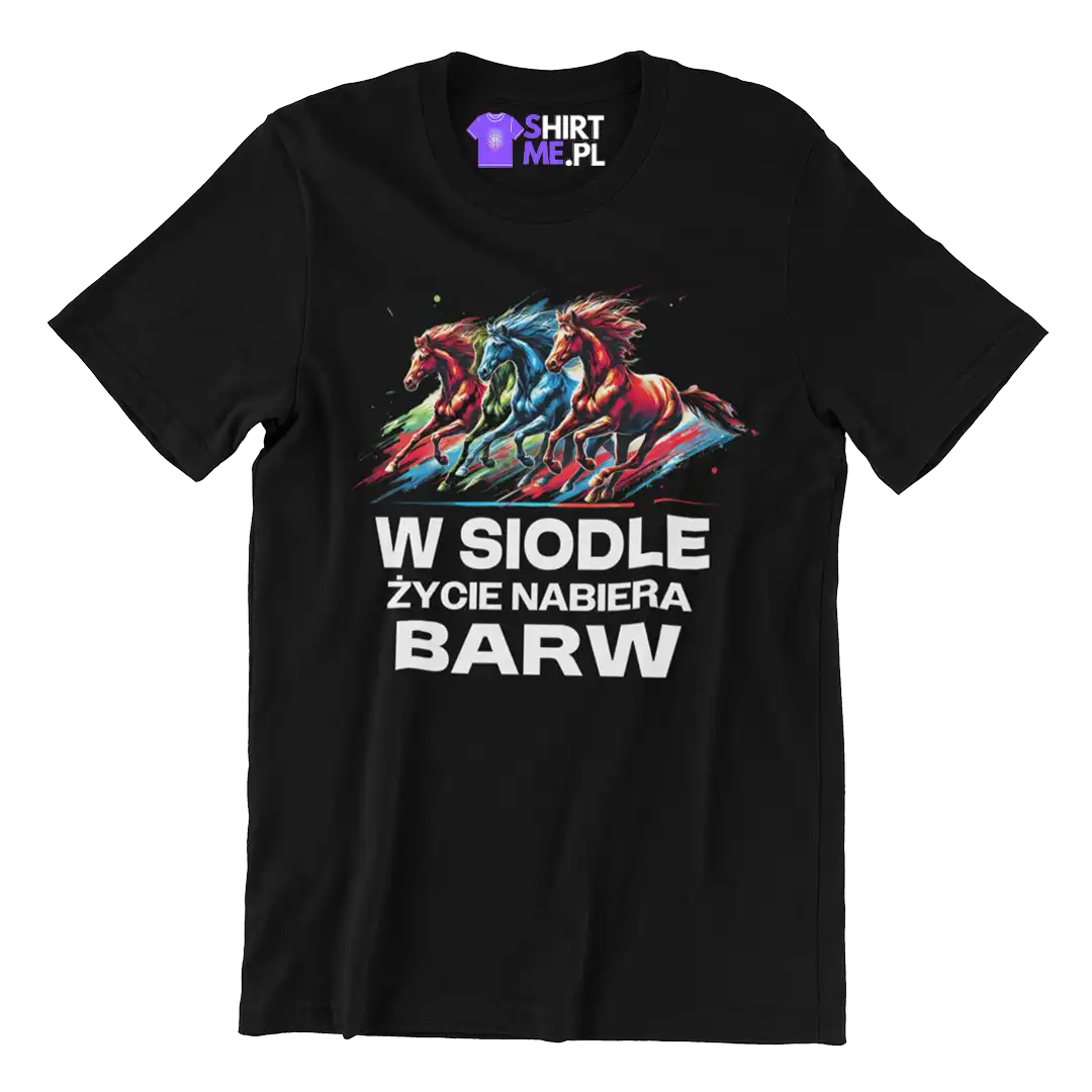 Koszulka z koniami dla osoby kochającą jazdę konną. Koszulka w siodle życie nabiera barw