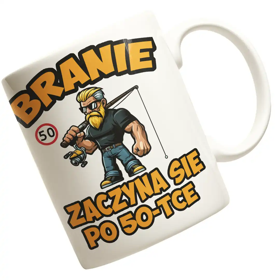 Kubek na prezent na 50 urodziny dla niego. Śmieszna koszulka na urodziny z nadrukiem- Branie zaczyna się po 50-tce